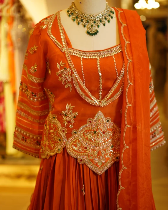 • Rust Lehenga With Organza Hand Work Blouse