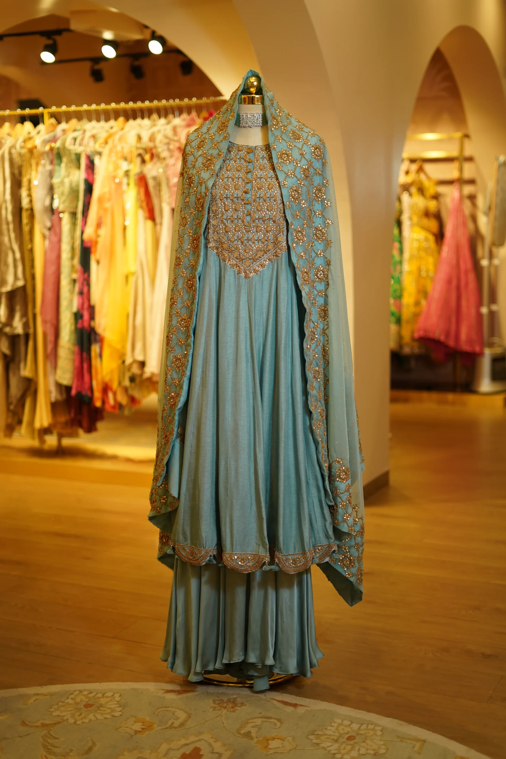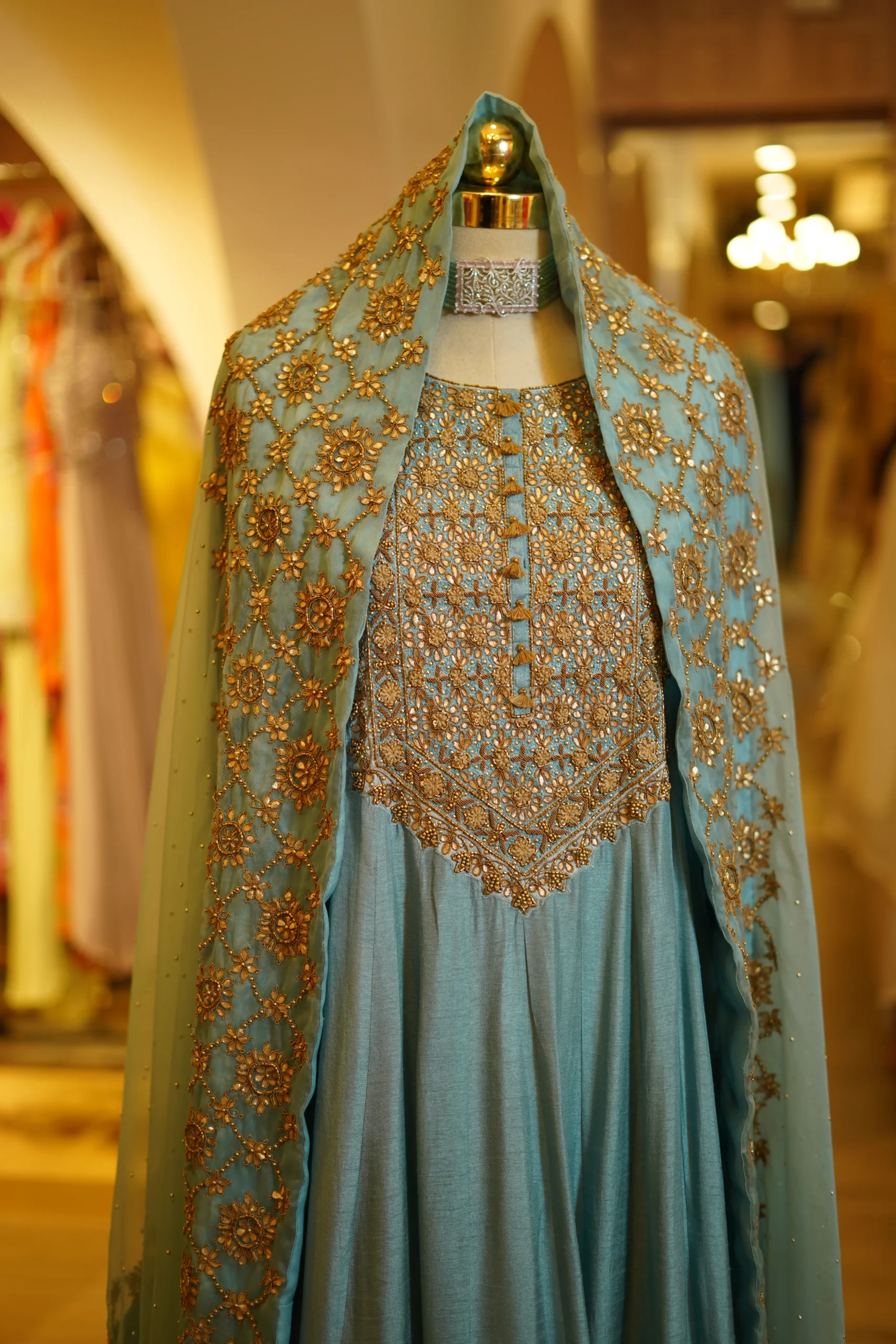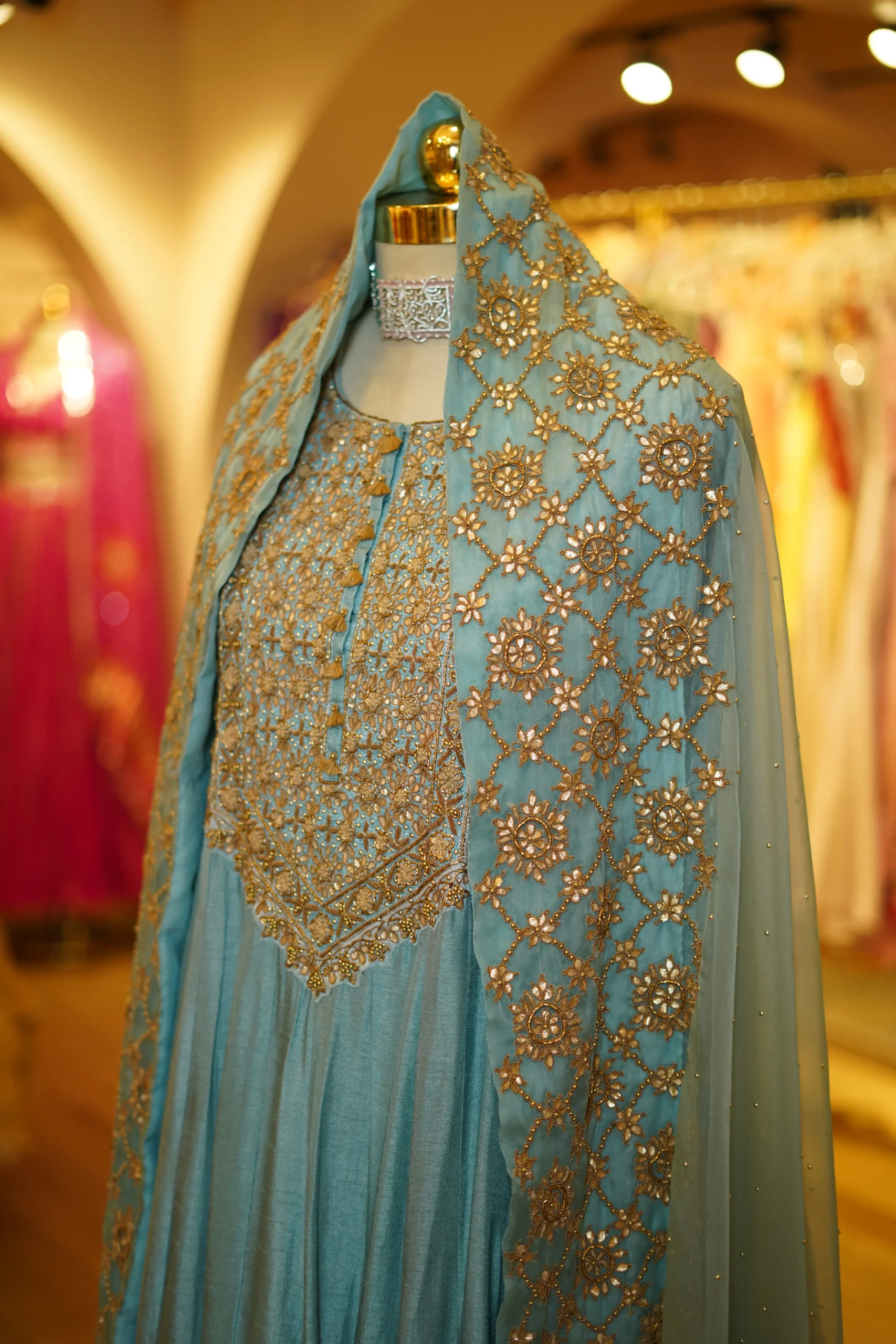 A graceful Anarkali paired with stylish palazzo pants and a handwork organza dupatta, offering an elegant customizable ensemble perfect for festive occasions and wedding celebrations ✨💫