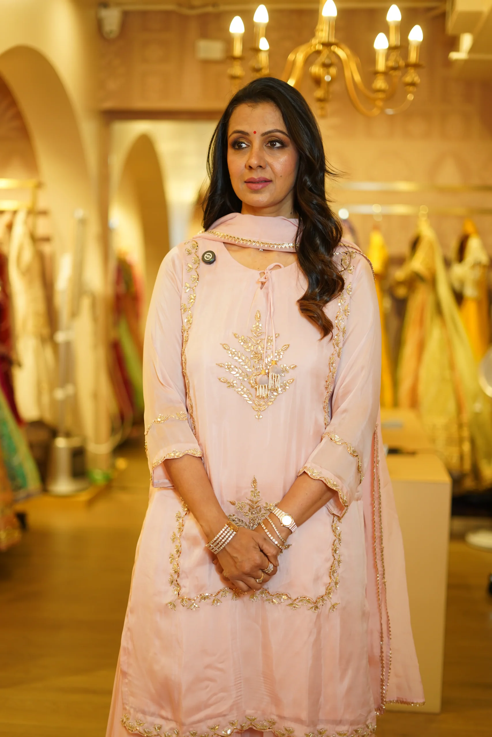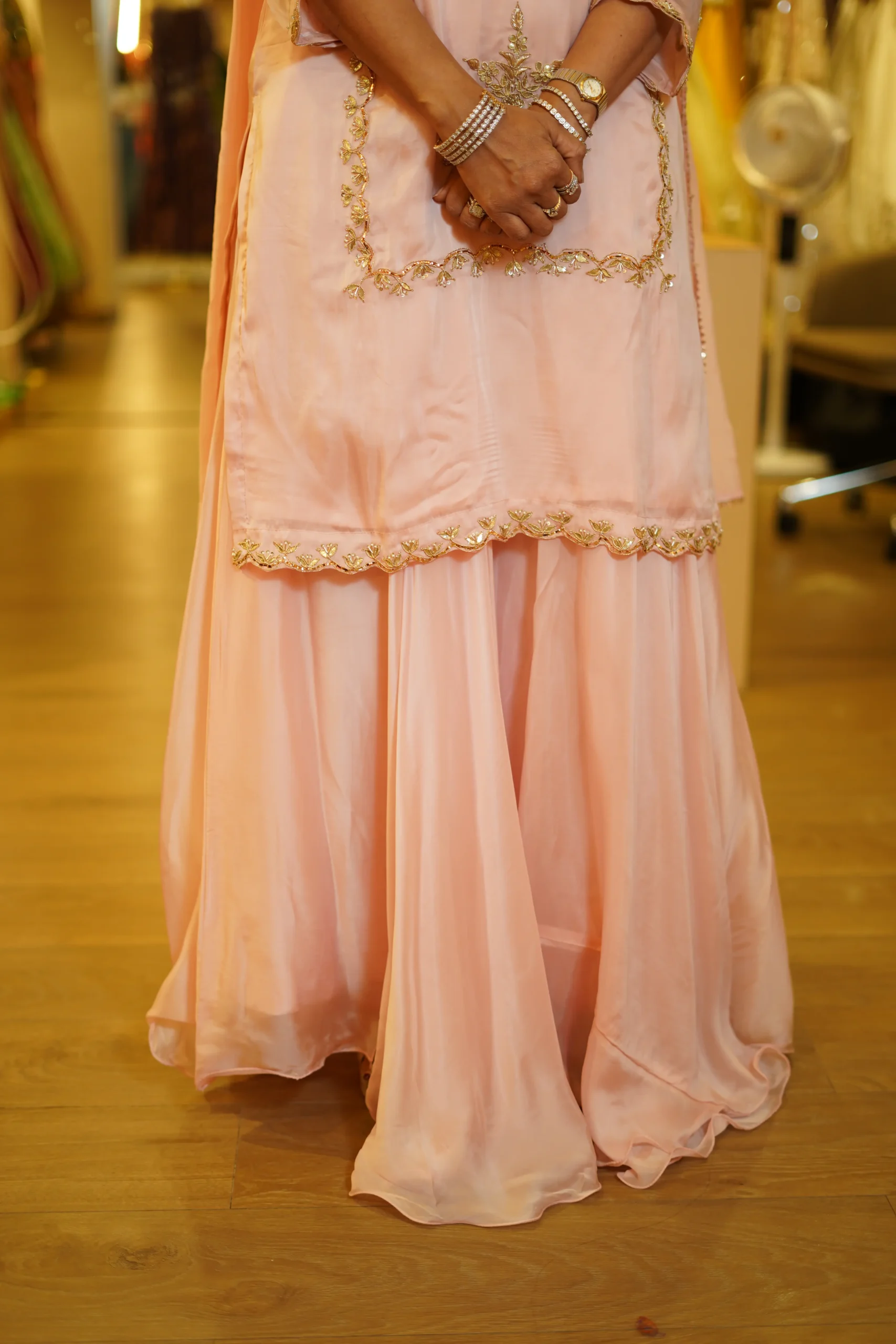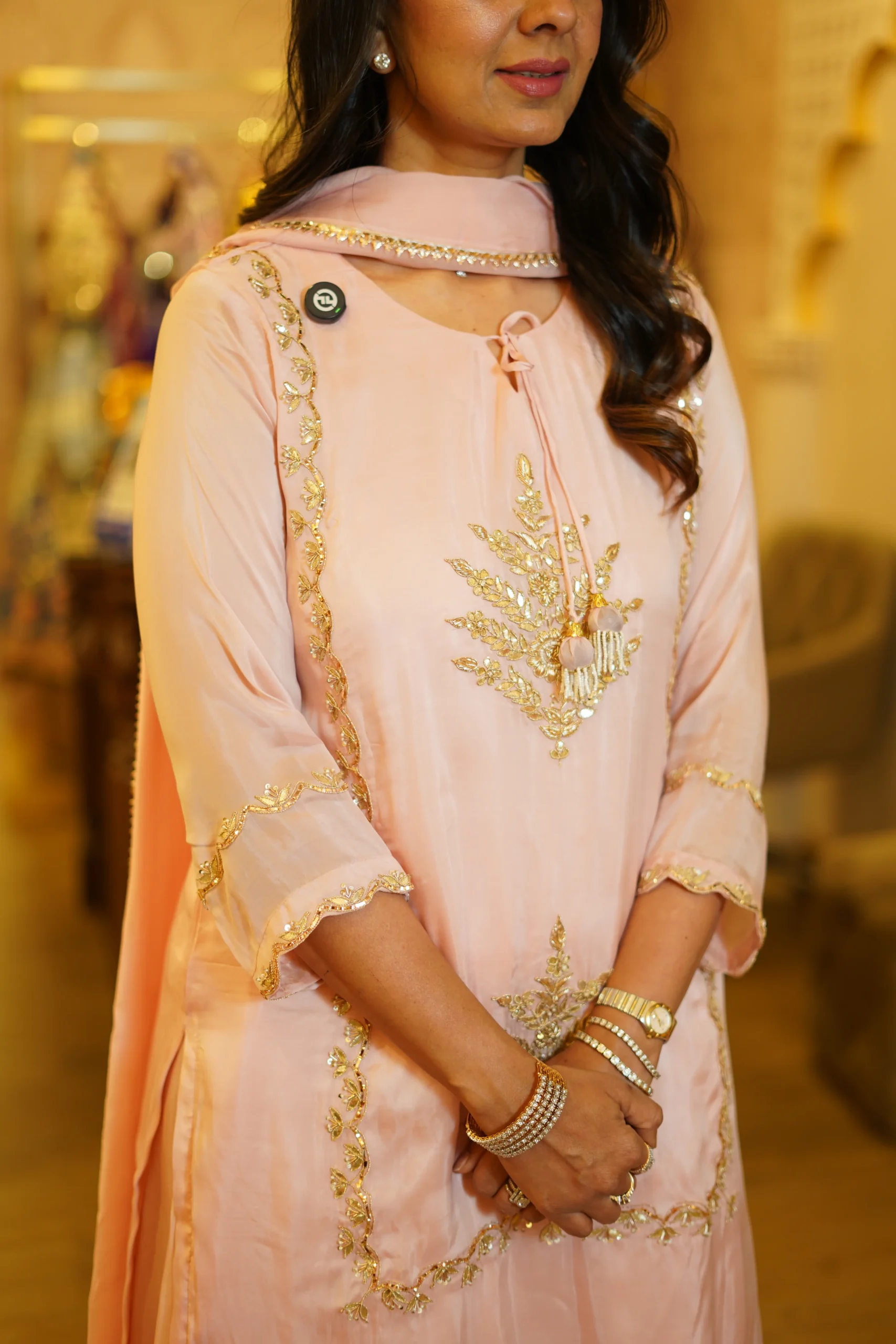 Baby Pink Hand Work Kurta With Silk Skirt And Dupatta