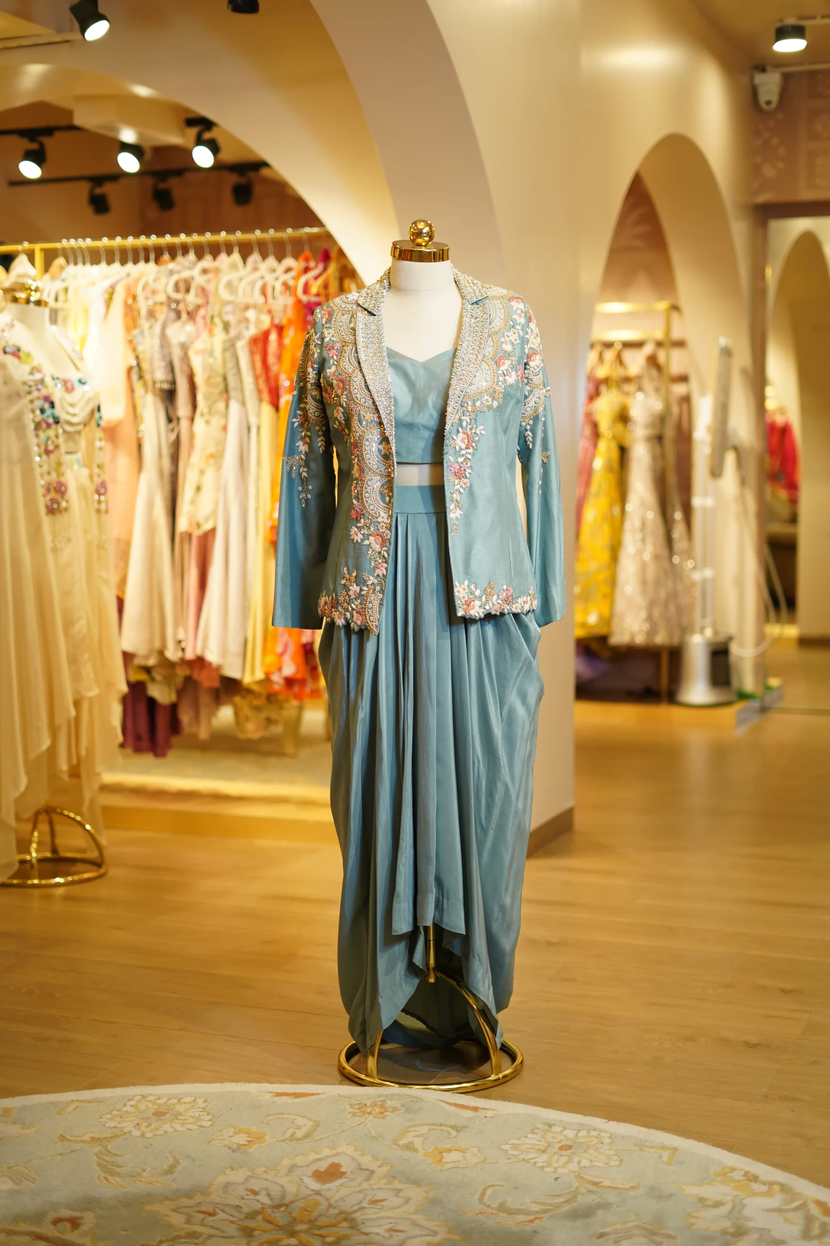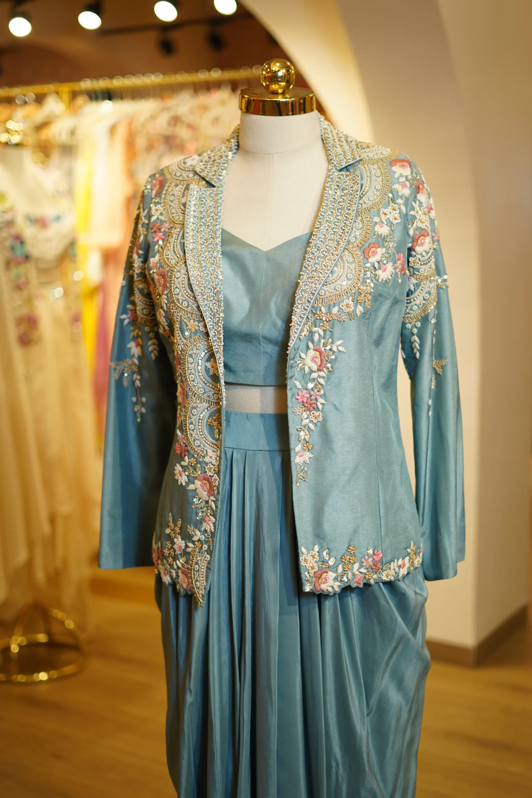 A stylish blue drape skirt paired with a hand-crafted blazer, ideal for evening functions and contemporary festive wear.