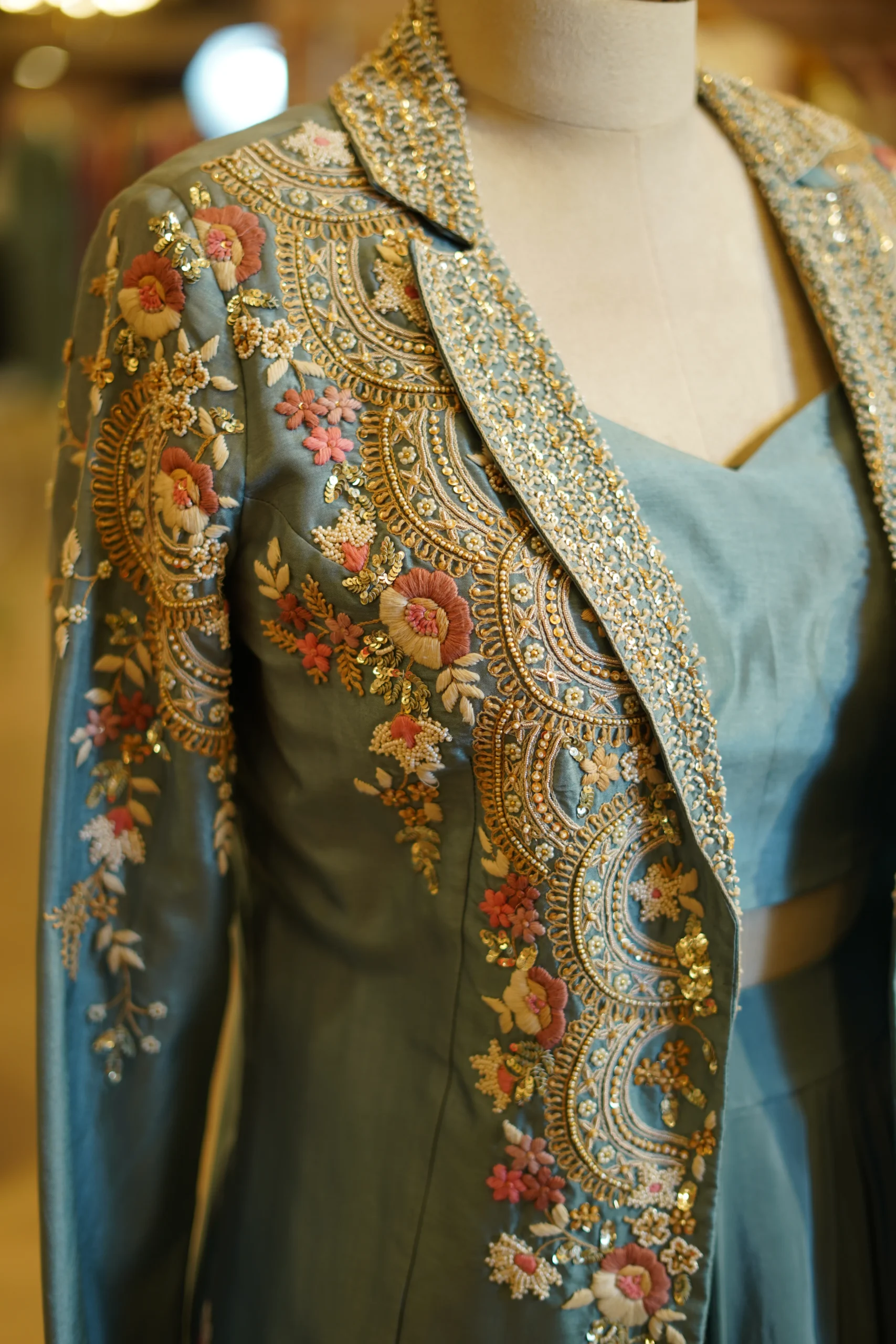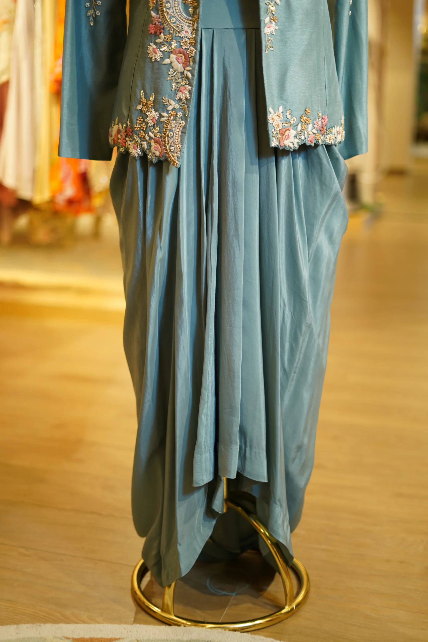 HomeIndo-WesternBlue Drape Skirt with Hand Work Blazer