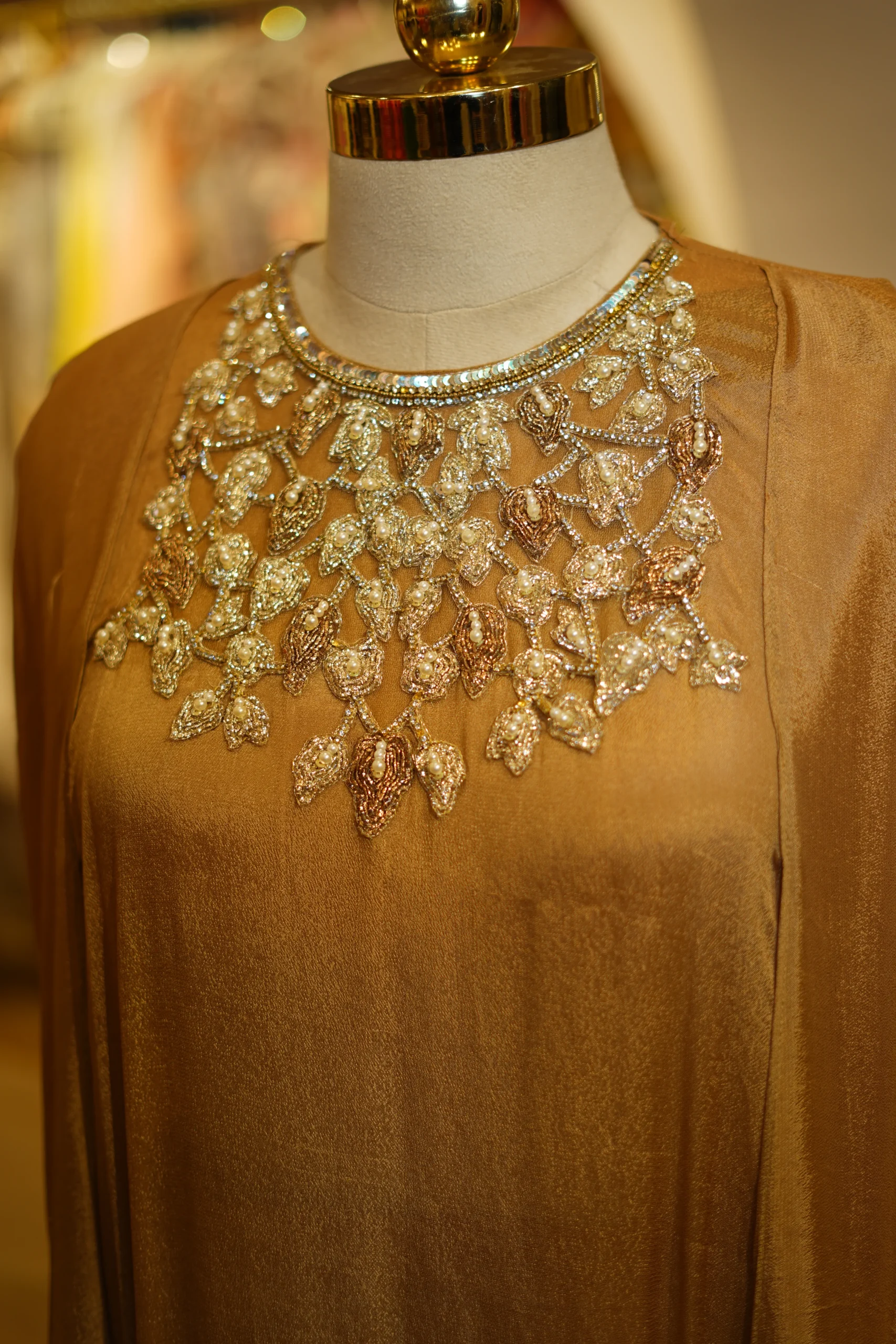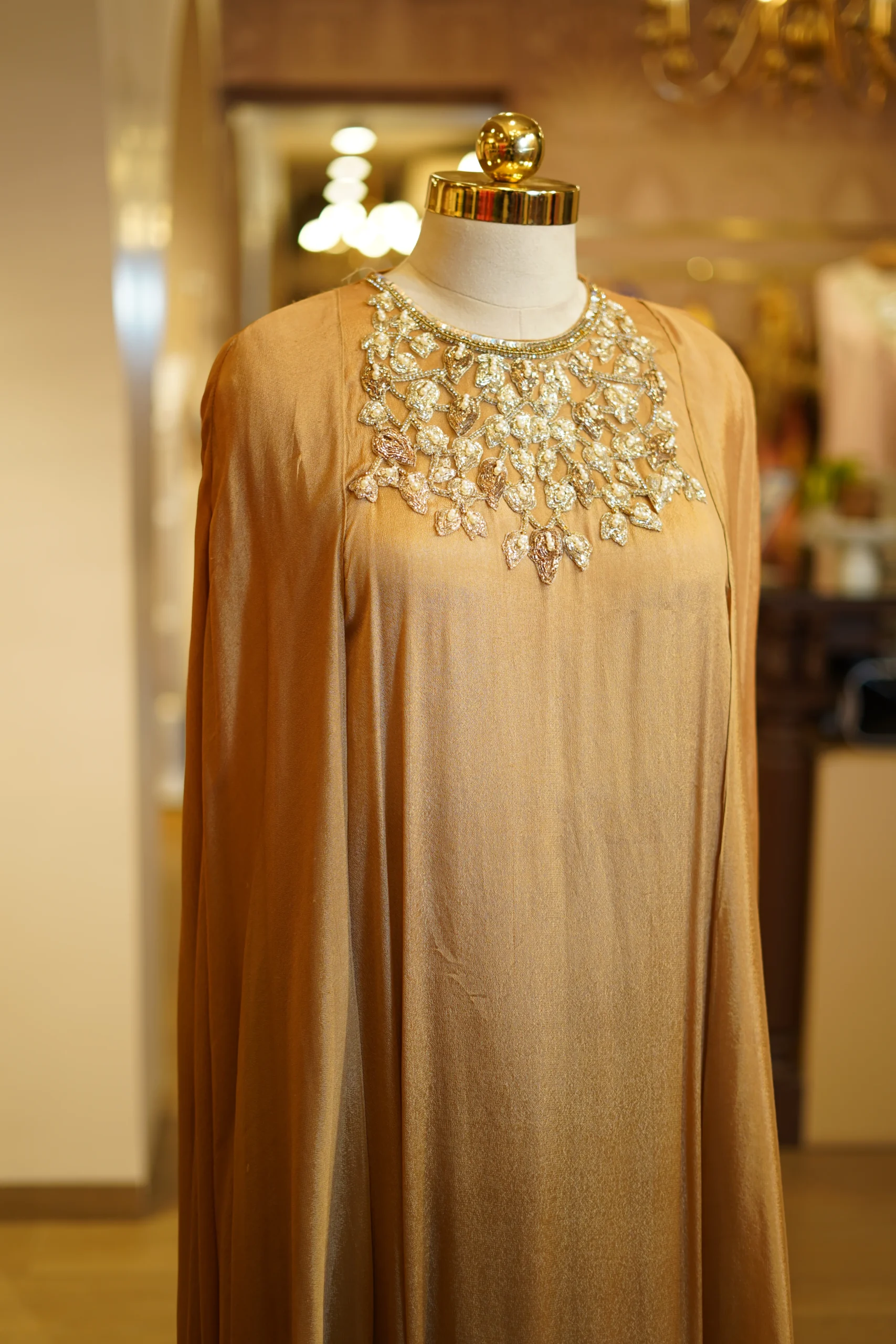 Brown and gold pants styled with a gold hand-worked cape, perfect for festive evenings and statement celebrations.