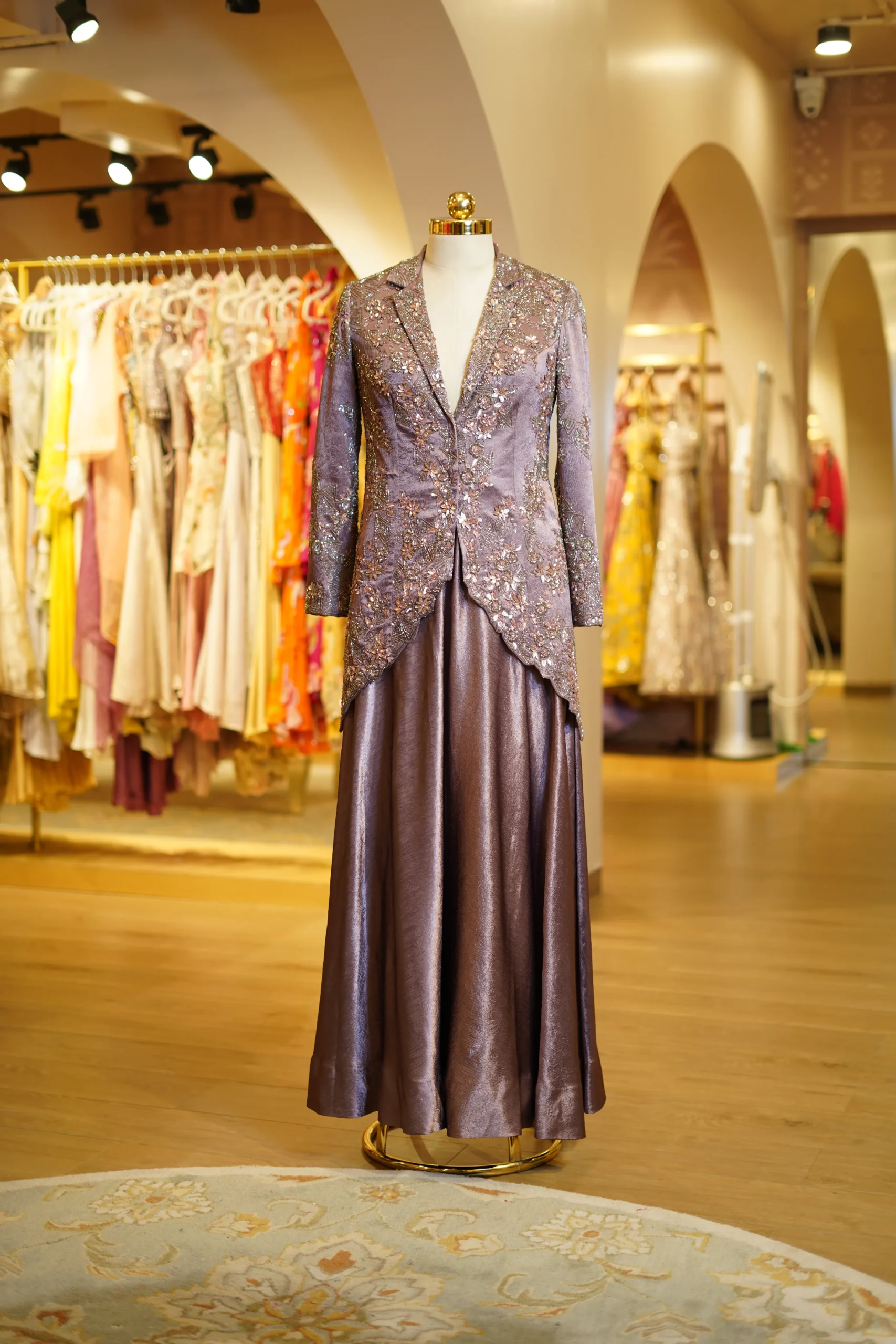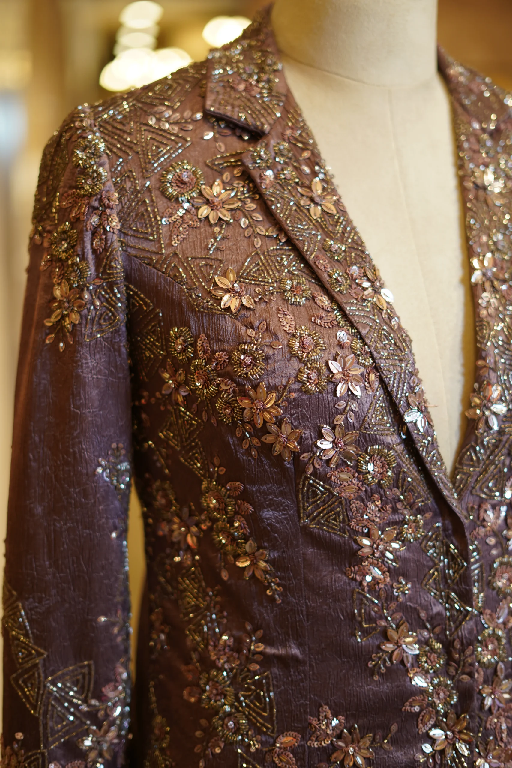 Sophisticated champagne-toned blazer paired with tailored pants, perfect for elegant celebrations and statement festive looks.