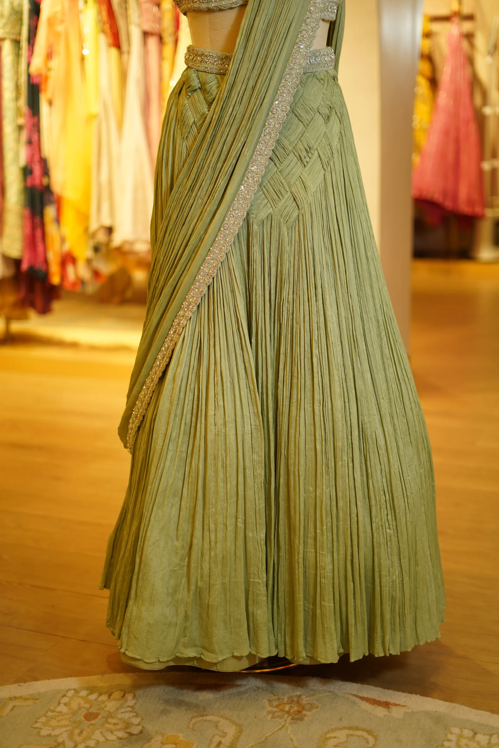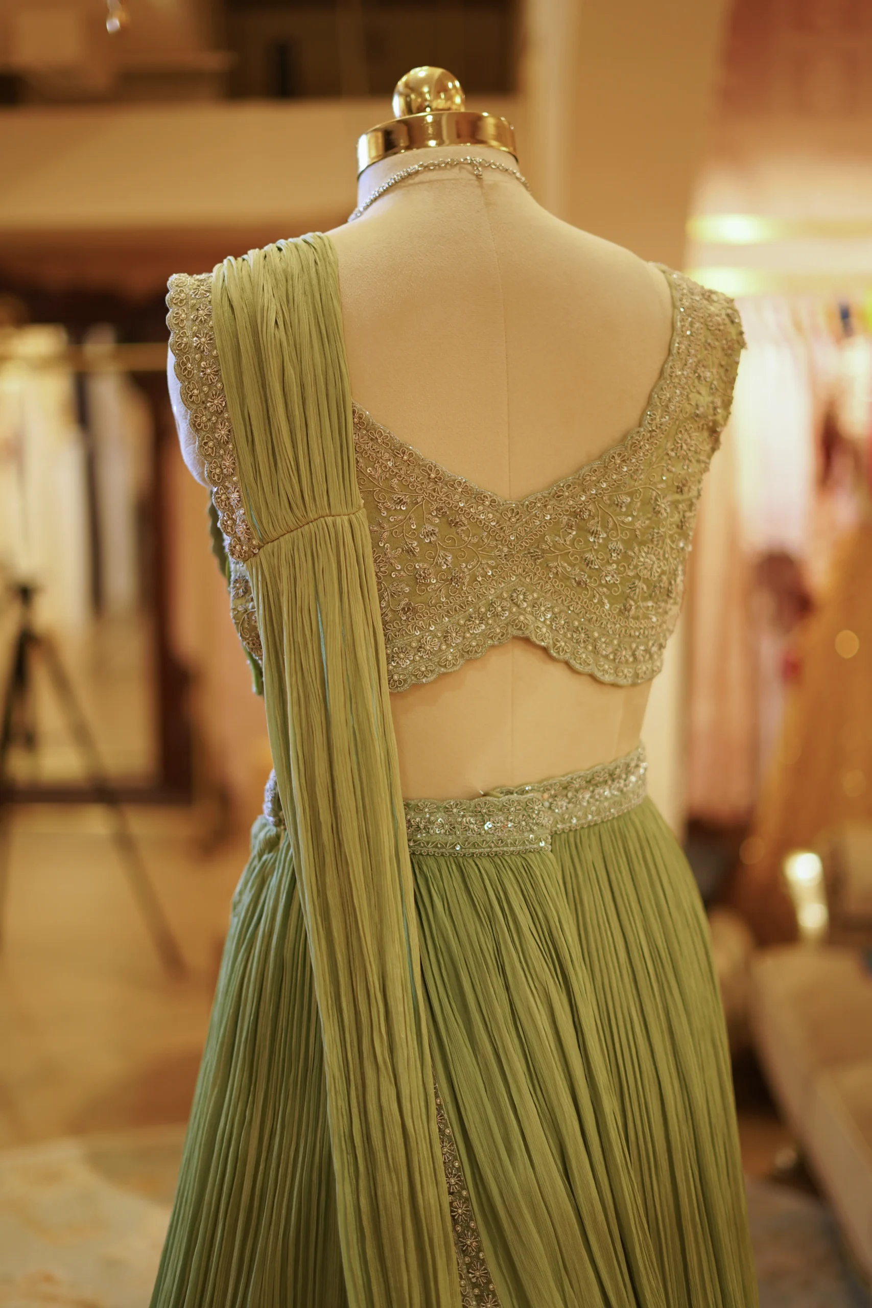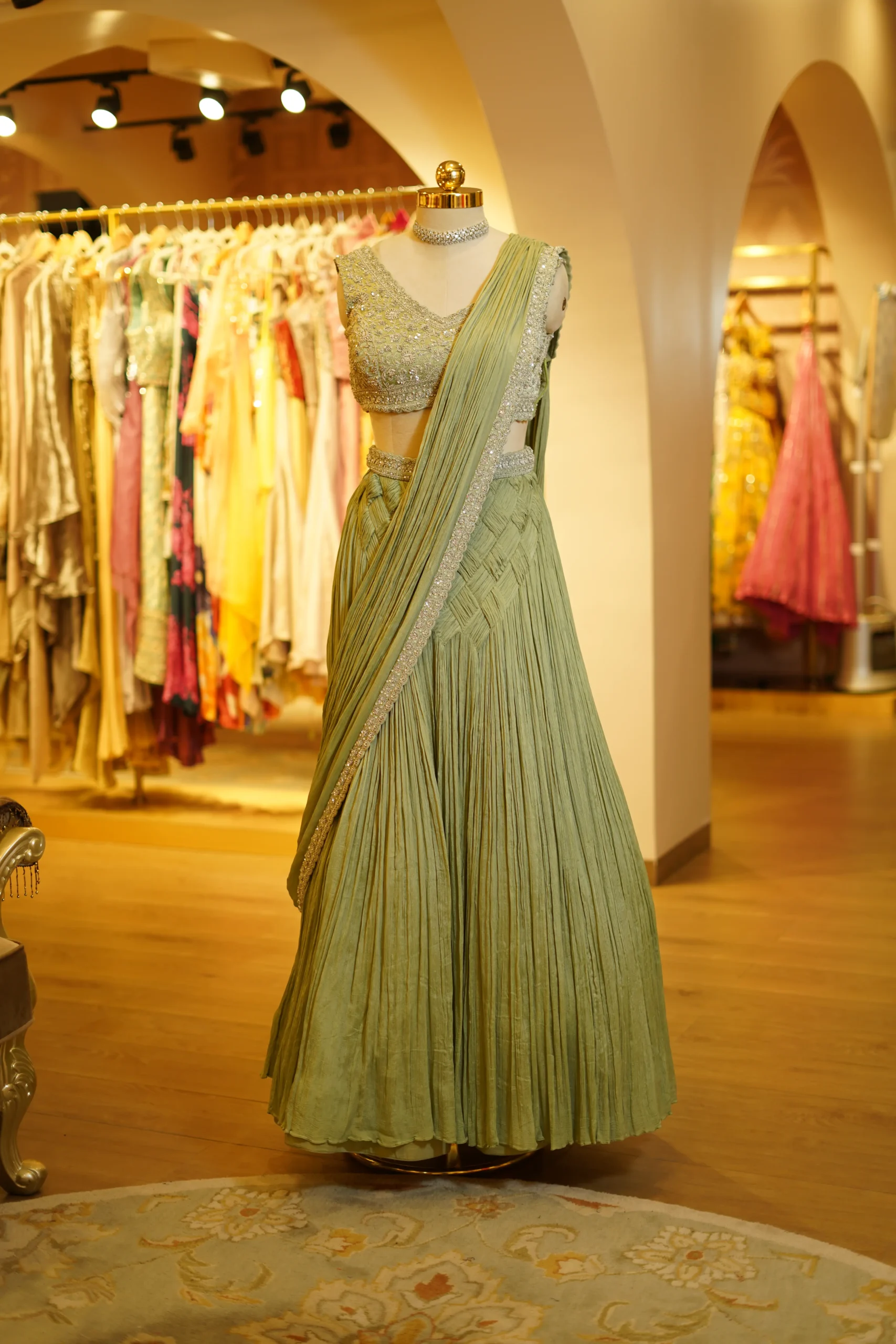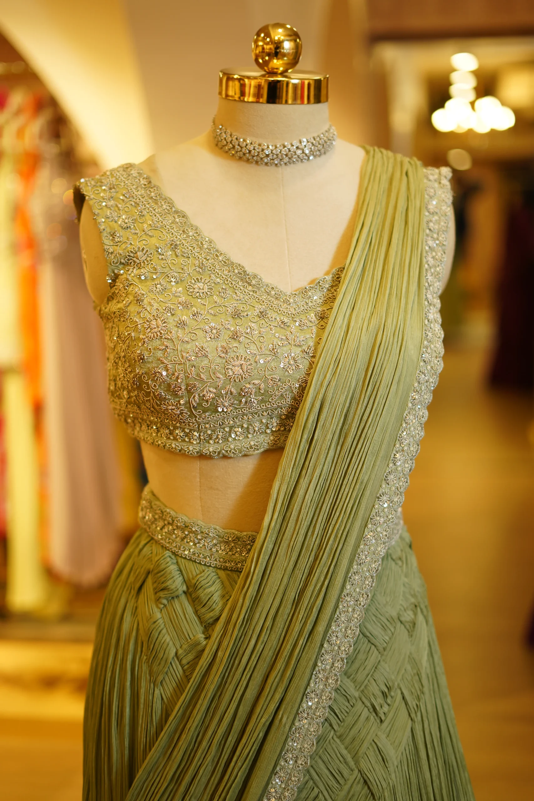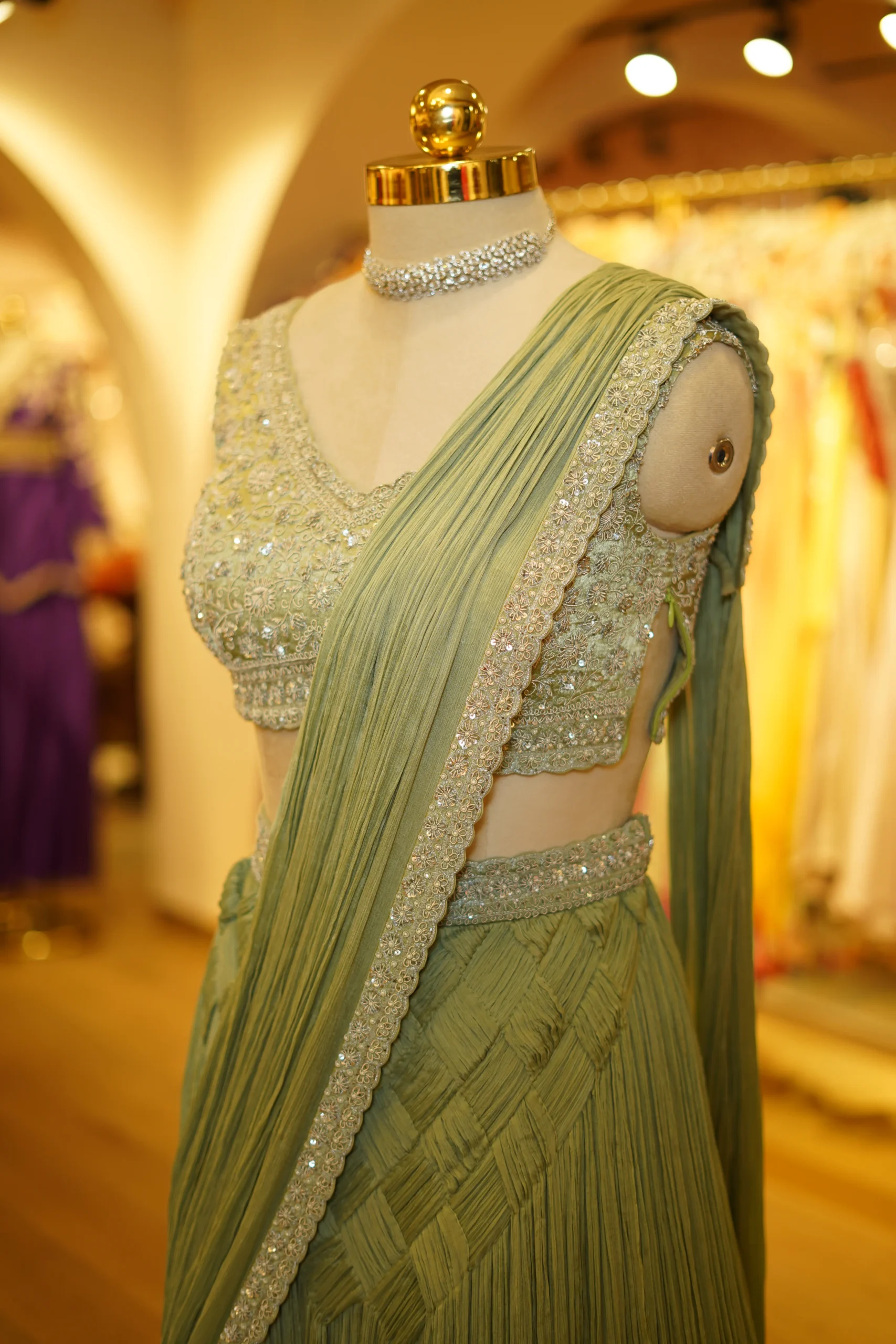 A graceful crush lehenga paired with a zardozi hand-embroidered blouse and an attached draped dupatta, creating an elegant festive ensemble perfect for weddings and special celebrations ✨💫