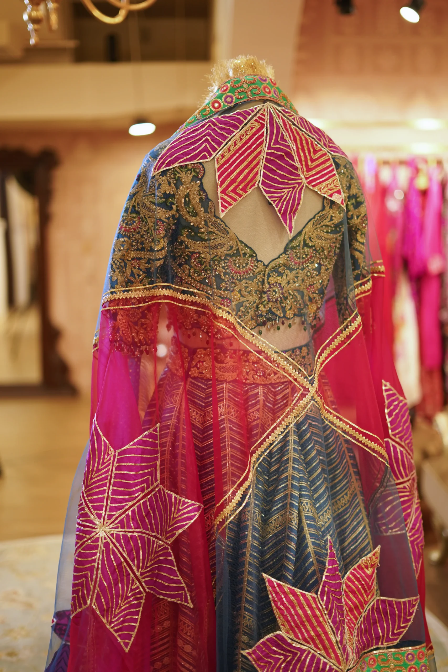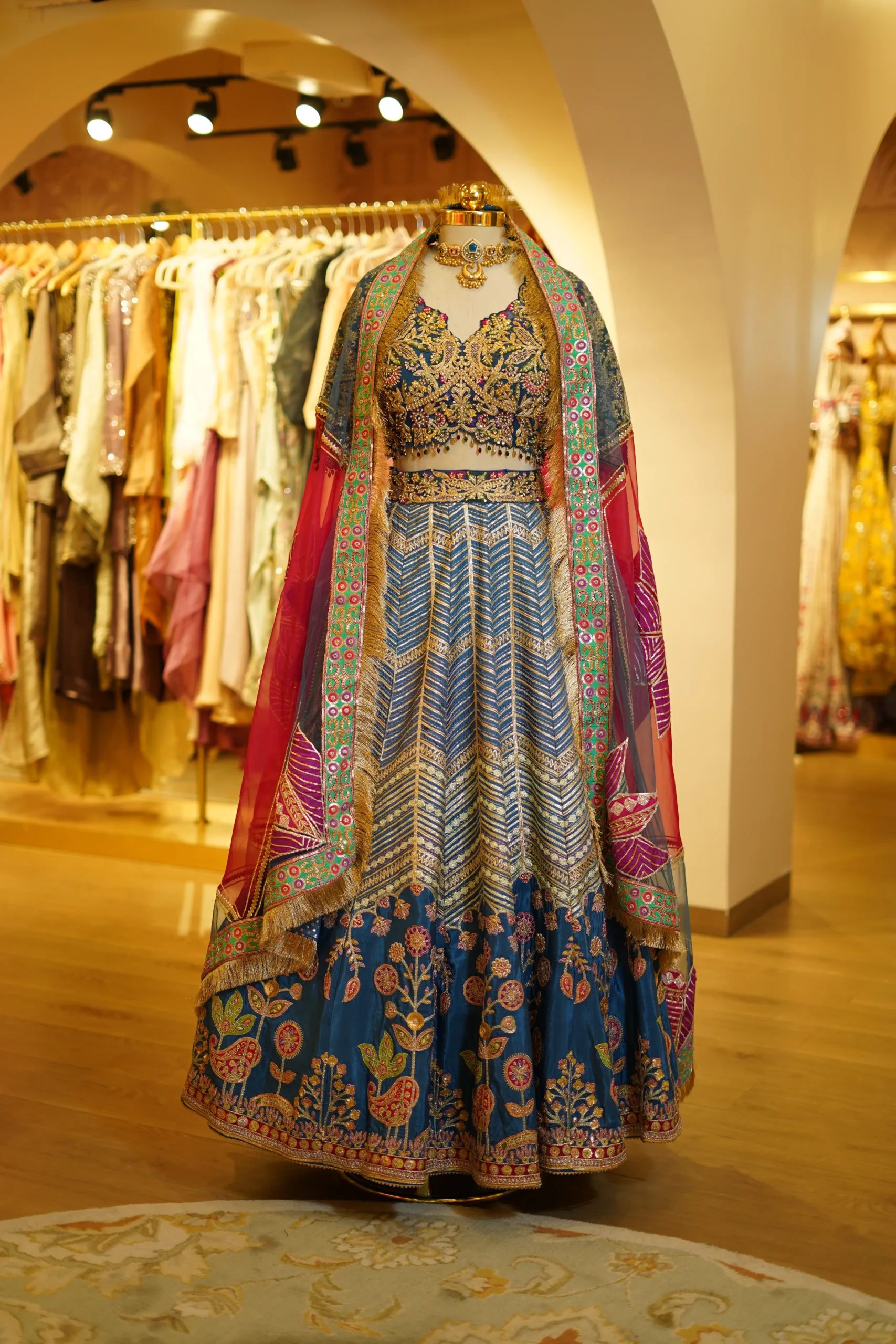 A graceful dust blue lehenga paired with a handworked blouse and organza finish, complemented by a soft net dupatta for an elegant festive and wedding-ready look ✨💫