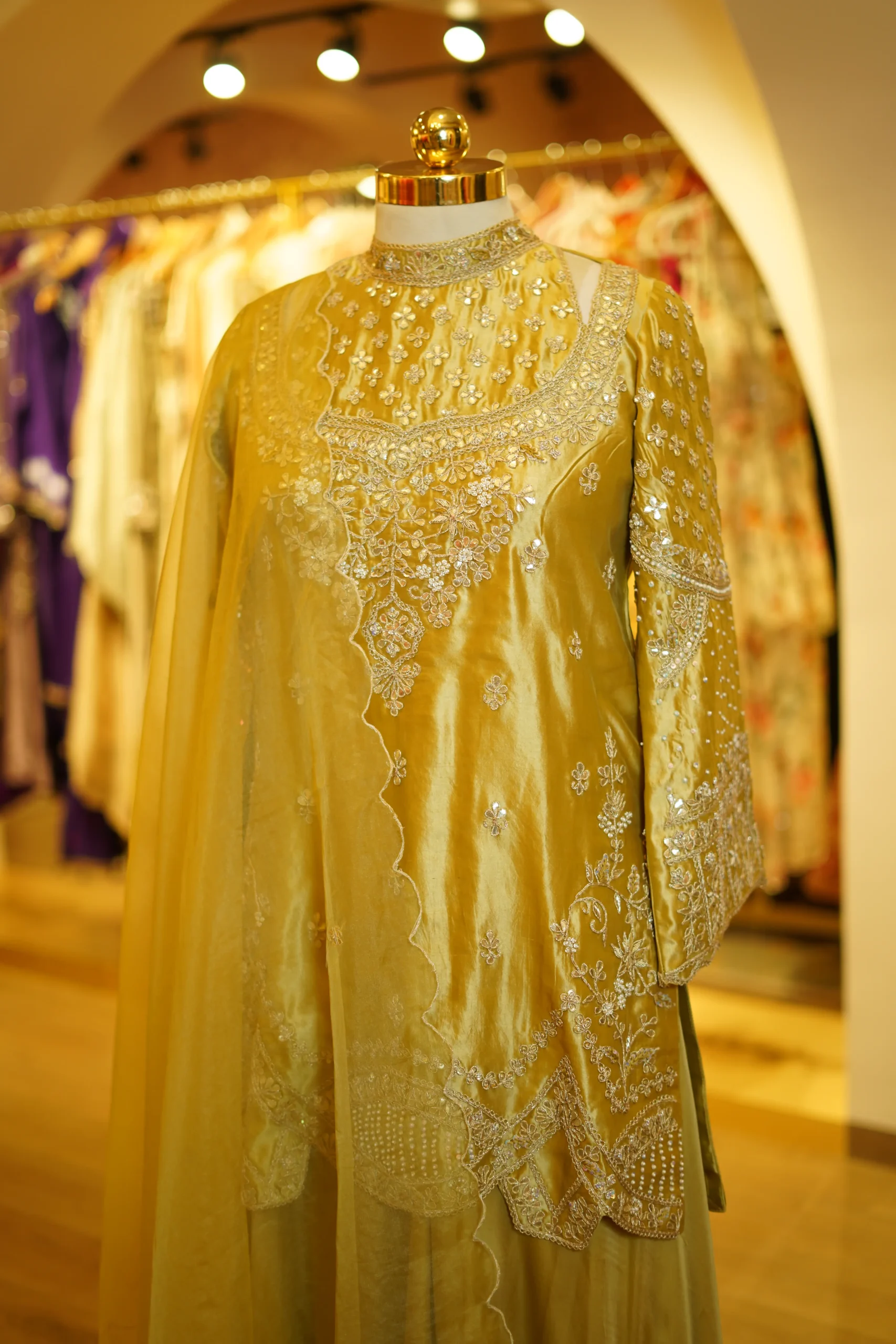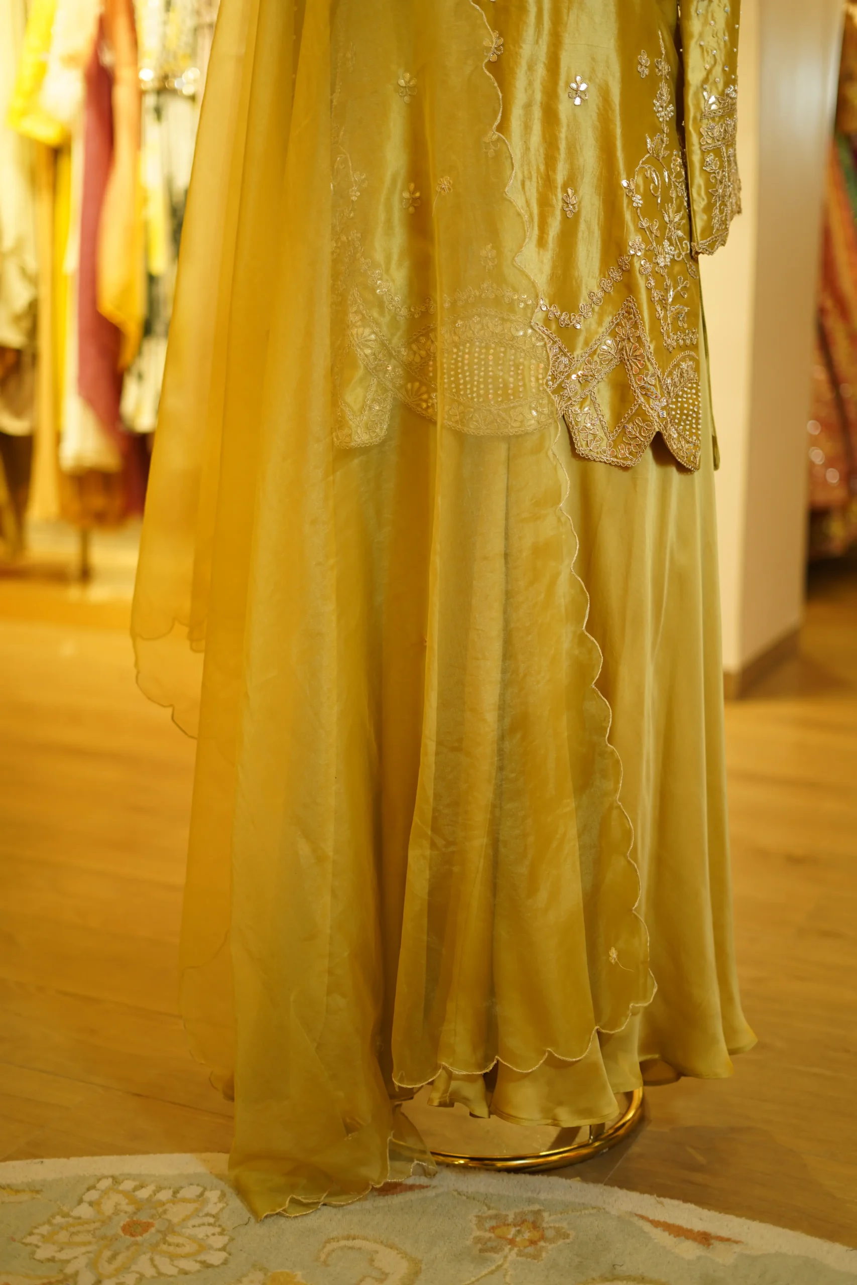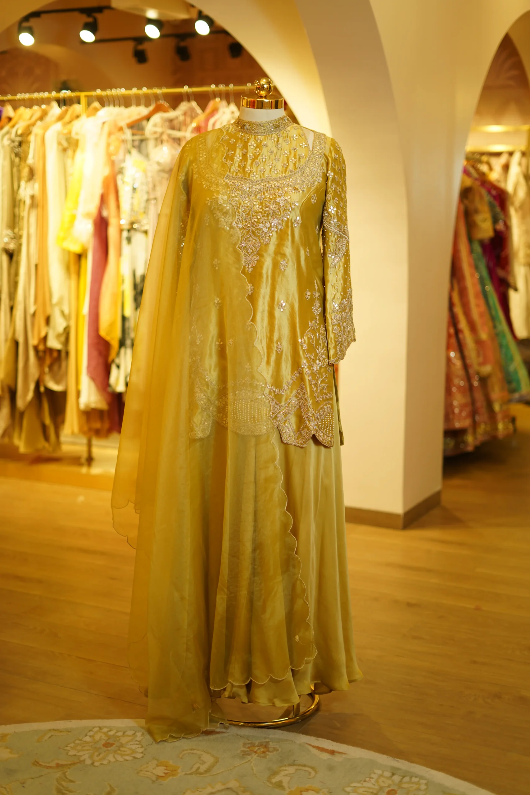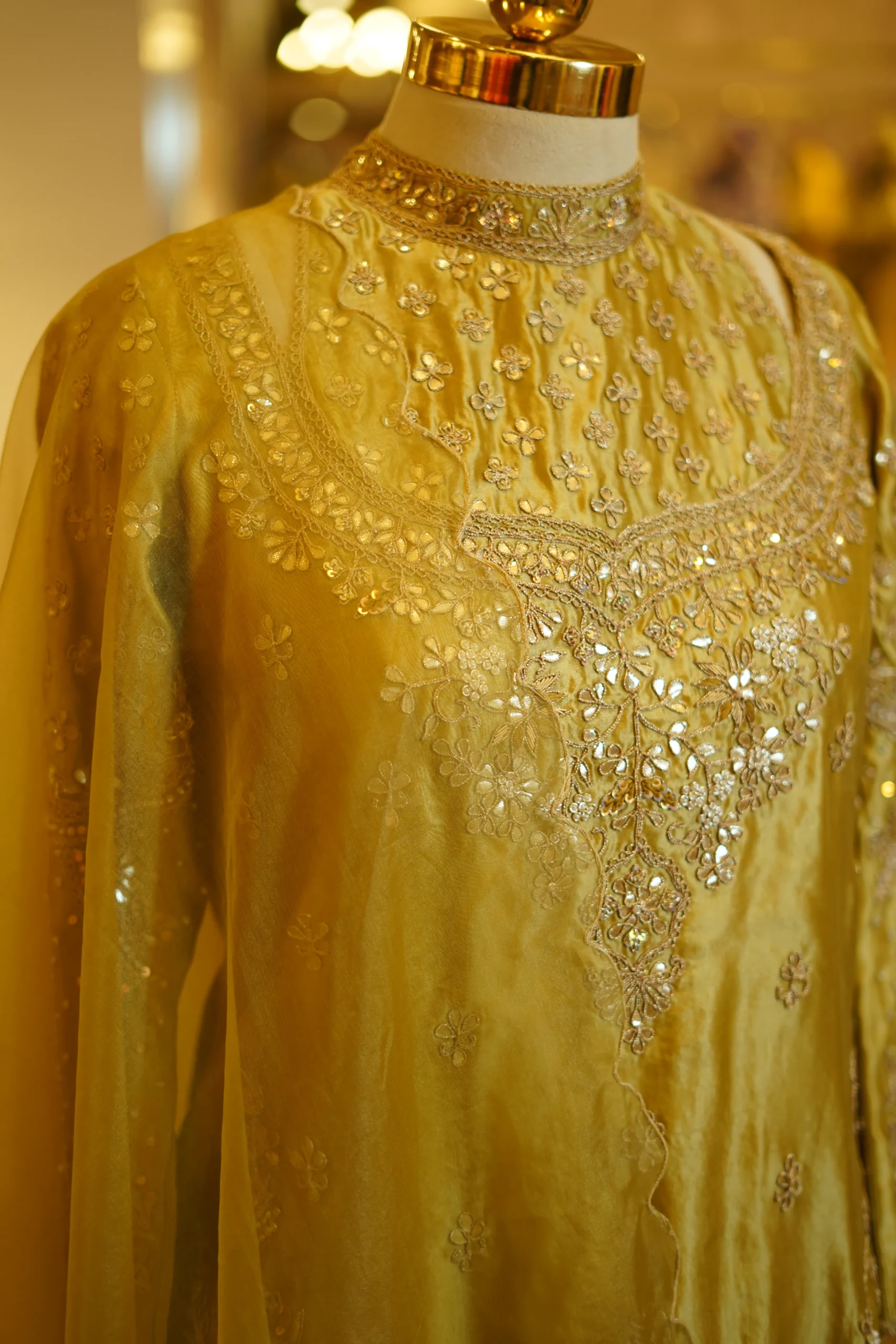A refined gold embroidery kurta paired with a soft silk skirt and an organza dupatta, creating an elegant festive ensemble perfect for weddings and special celebrations ✨💫