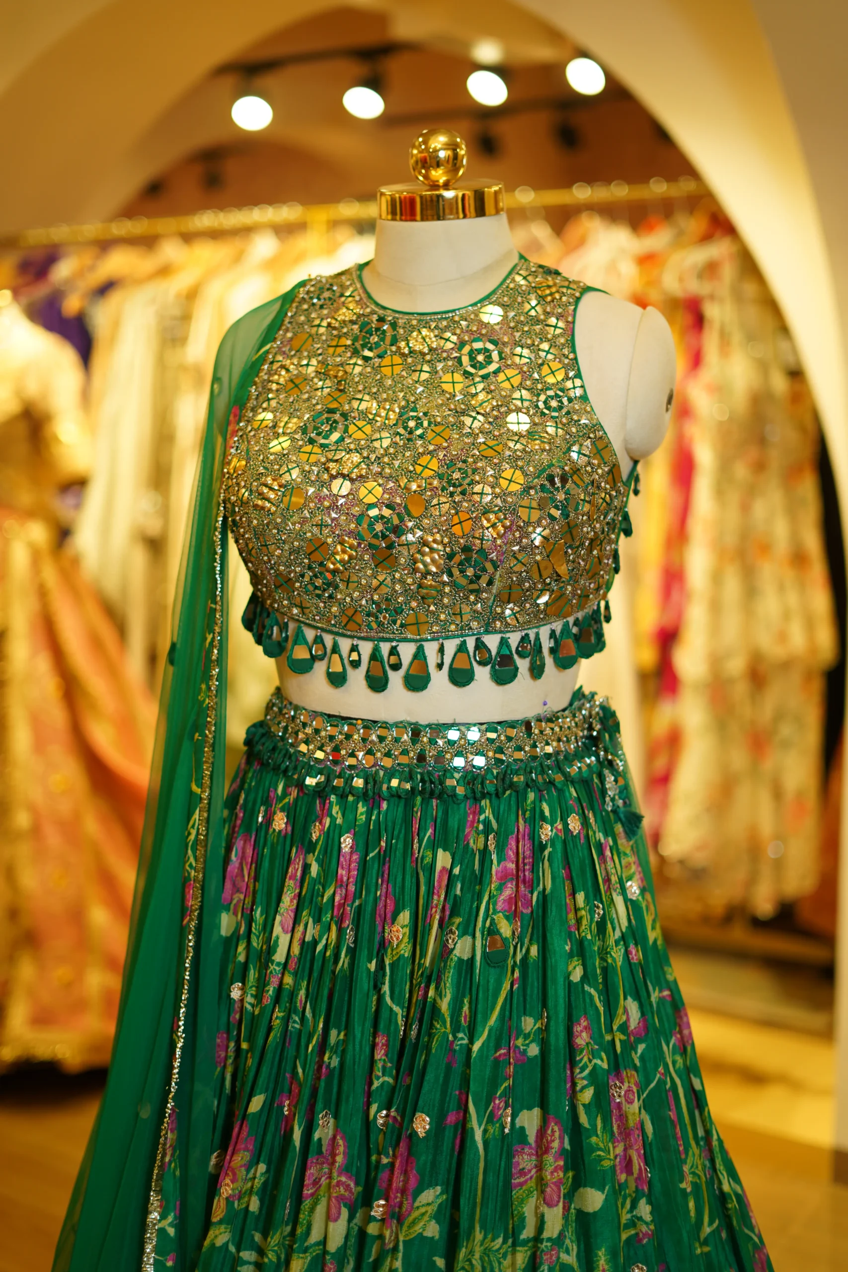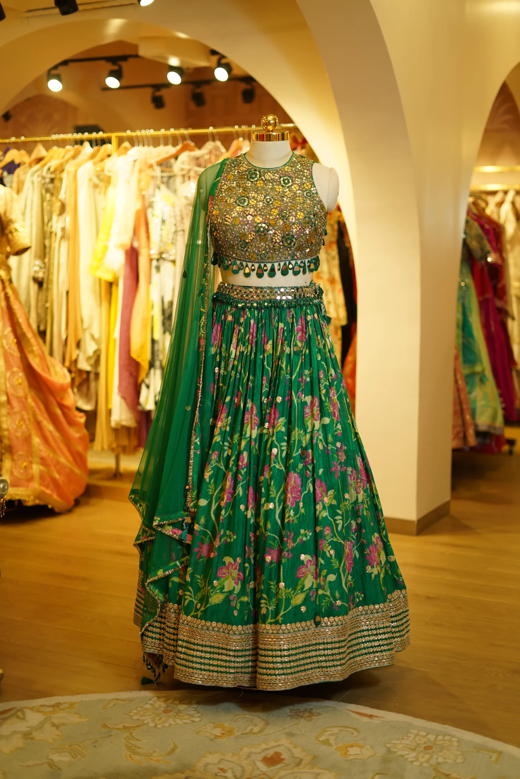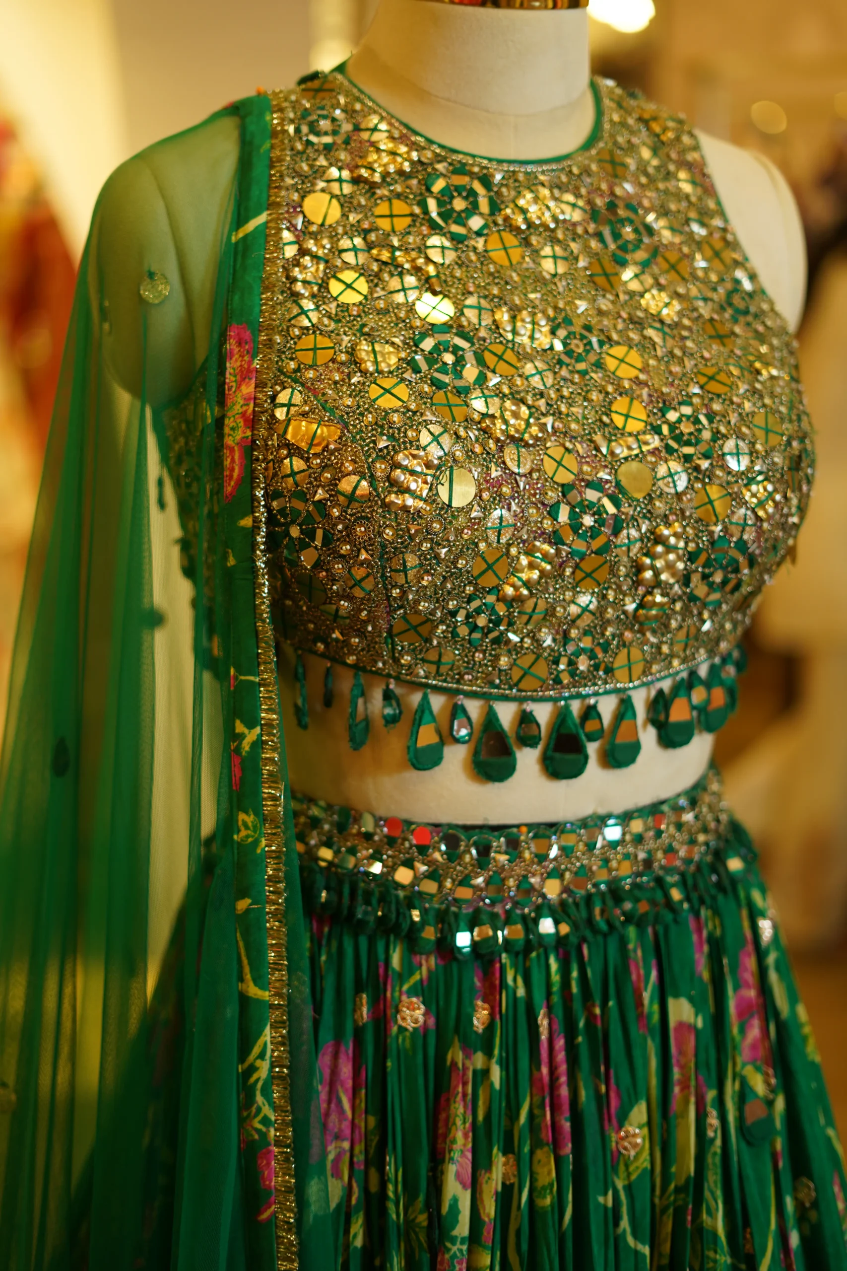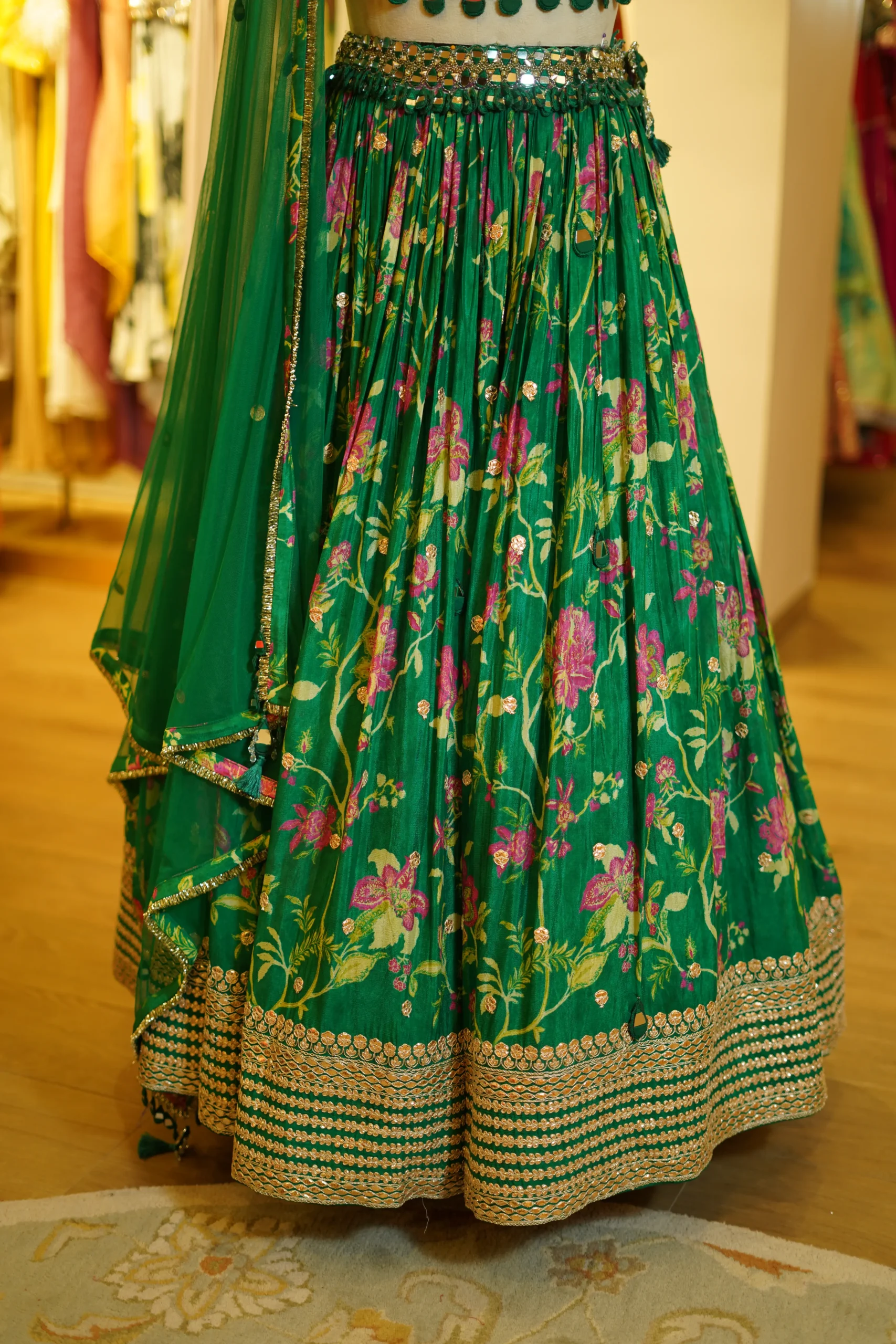 A vibrant green printed lehenga featuring gota work detailing on the skirt paired with an intricately worked blouse and a net dupatta, perfect for festive celebrations and traditional occasions ✨💫