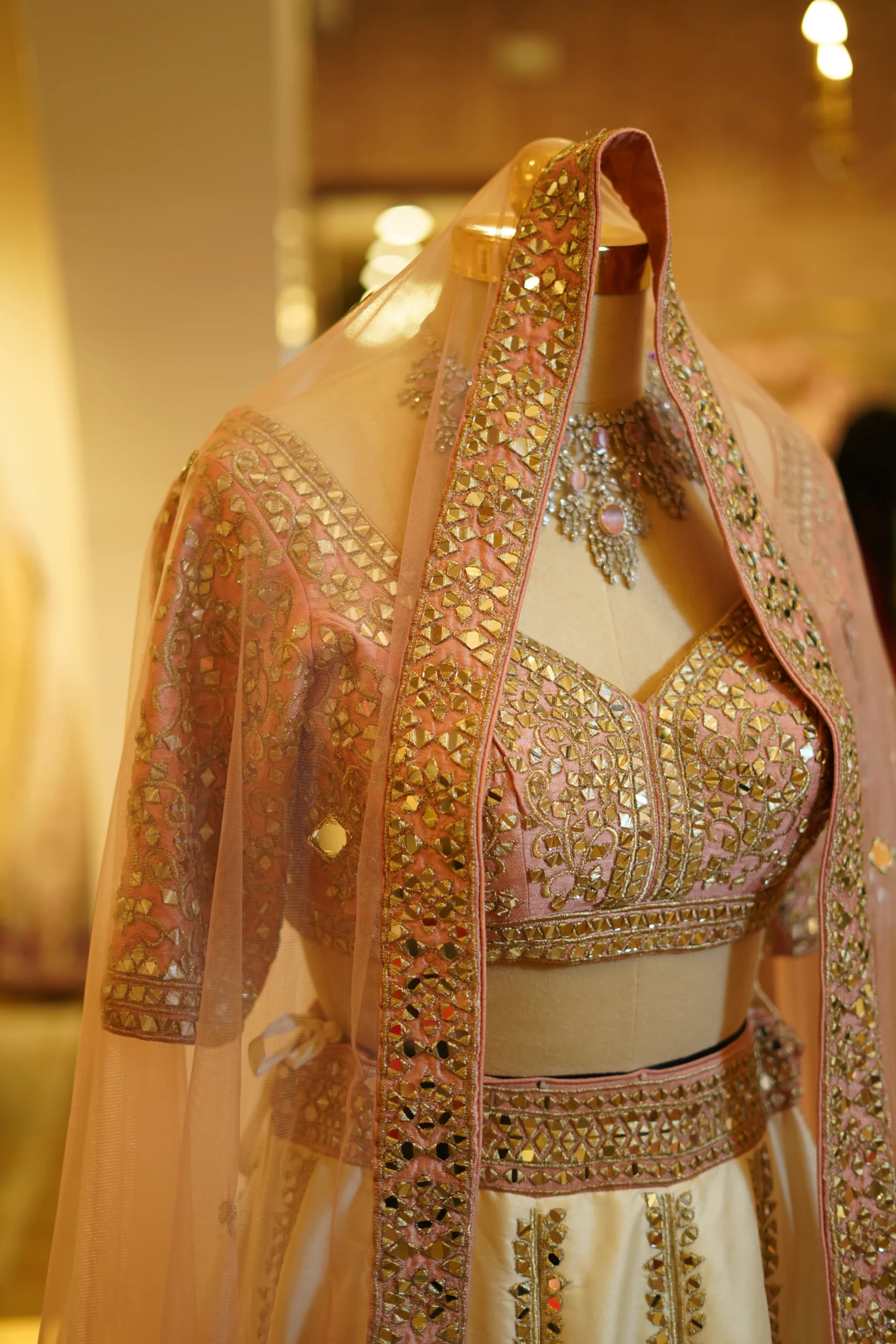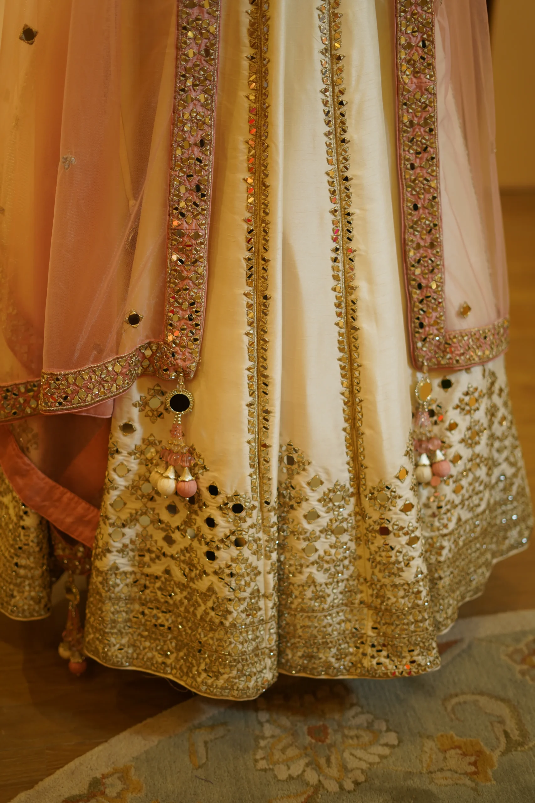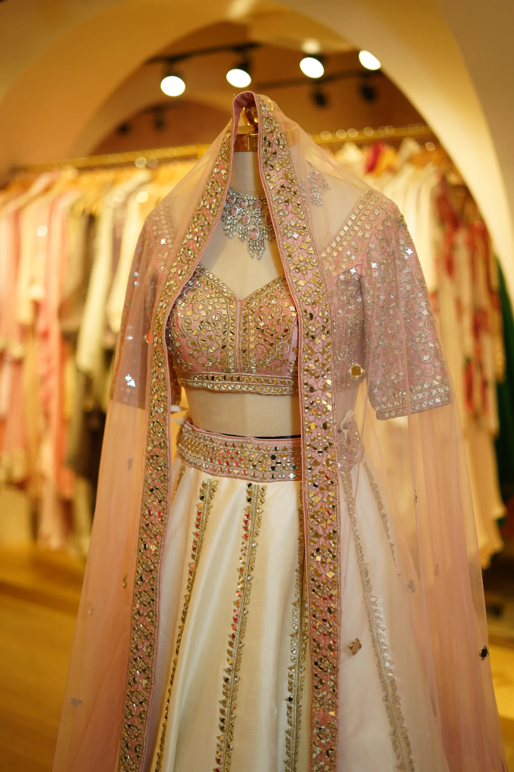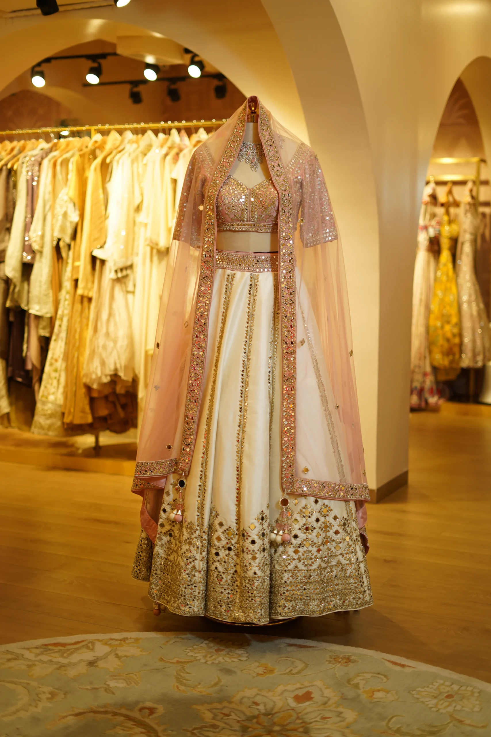 A graceful ivory and pink lehenga designed with elegant detailing and a timeless festive appeal. Perfect for weddings, engagement ceremonies, and grand celebrations.