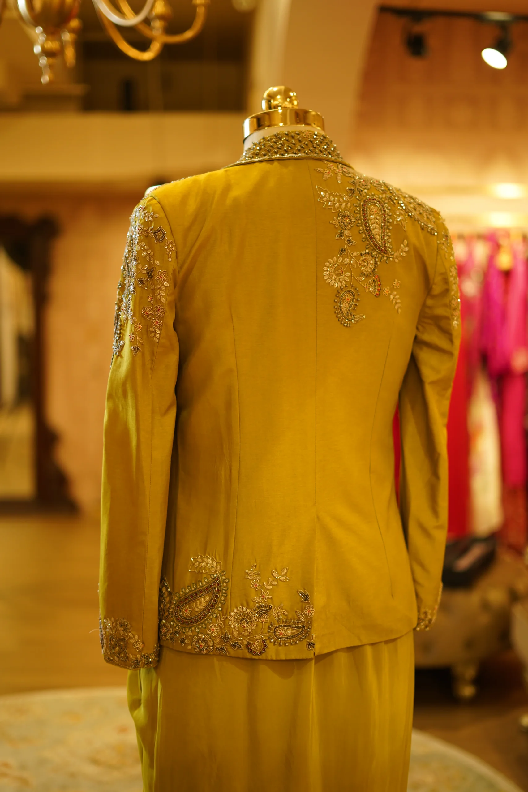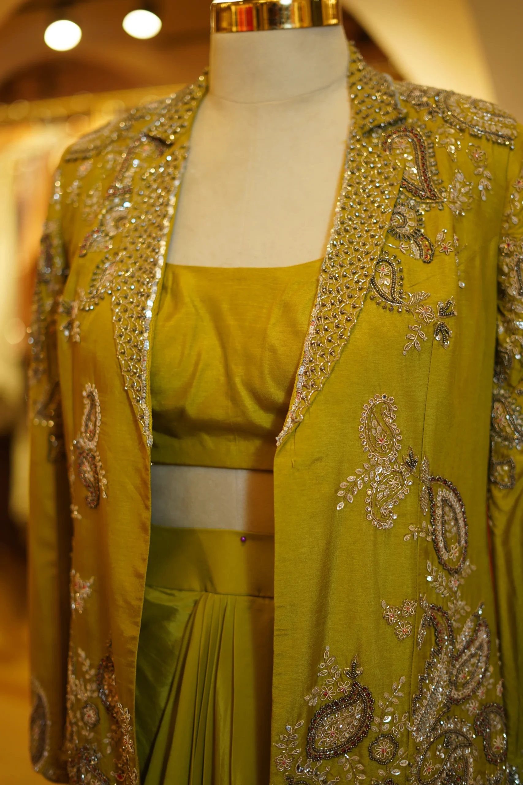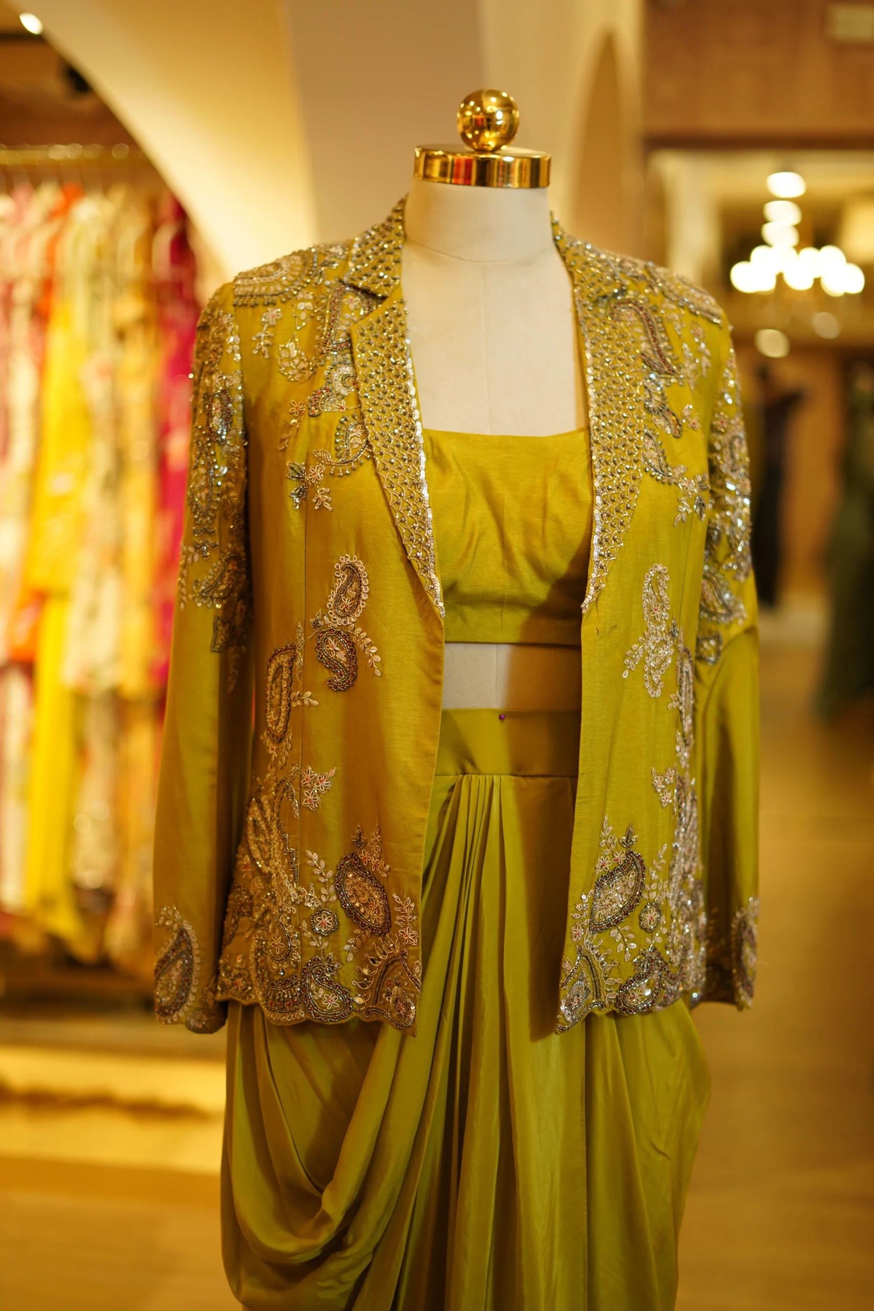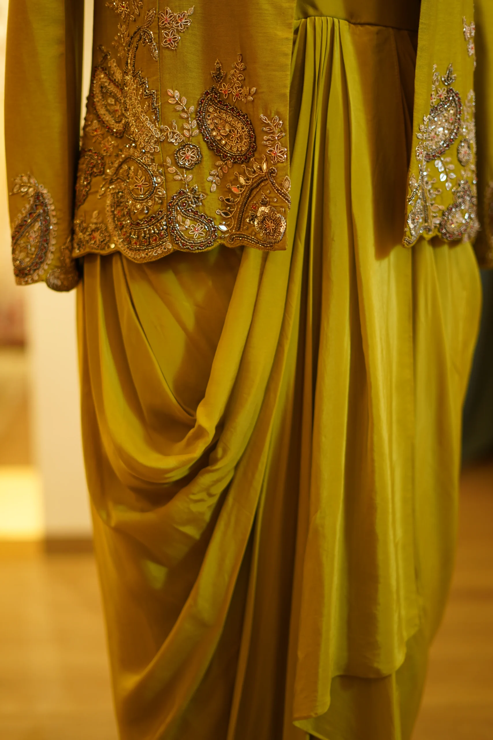 A stylish lime green drape skirt paired with a hand-worked blazer for a bold festive look. Perfect for modern celebrations and statement styling.
