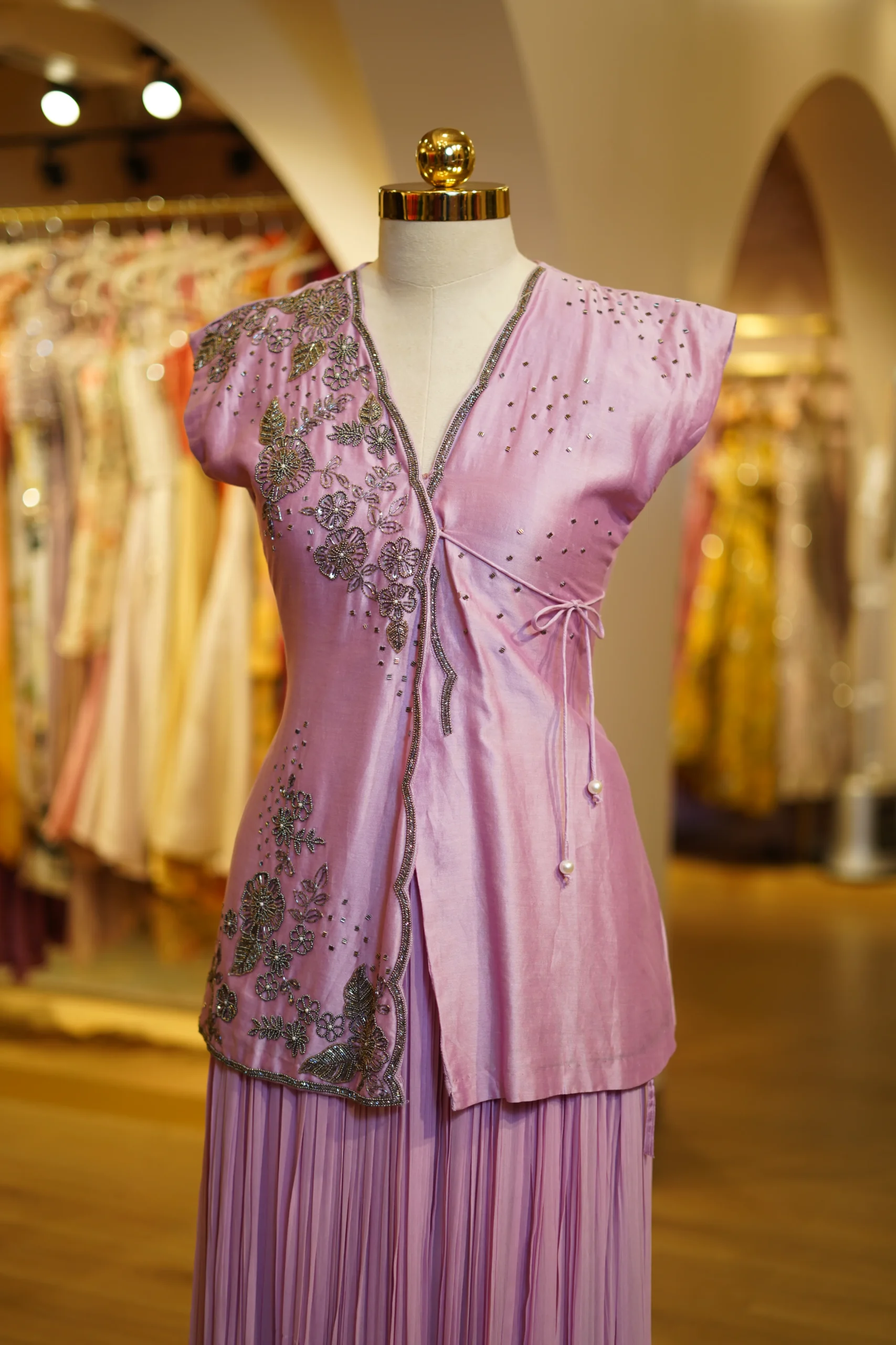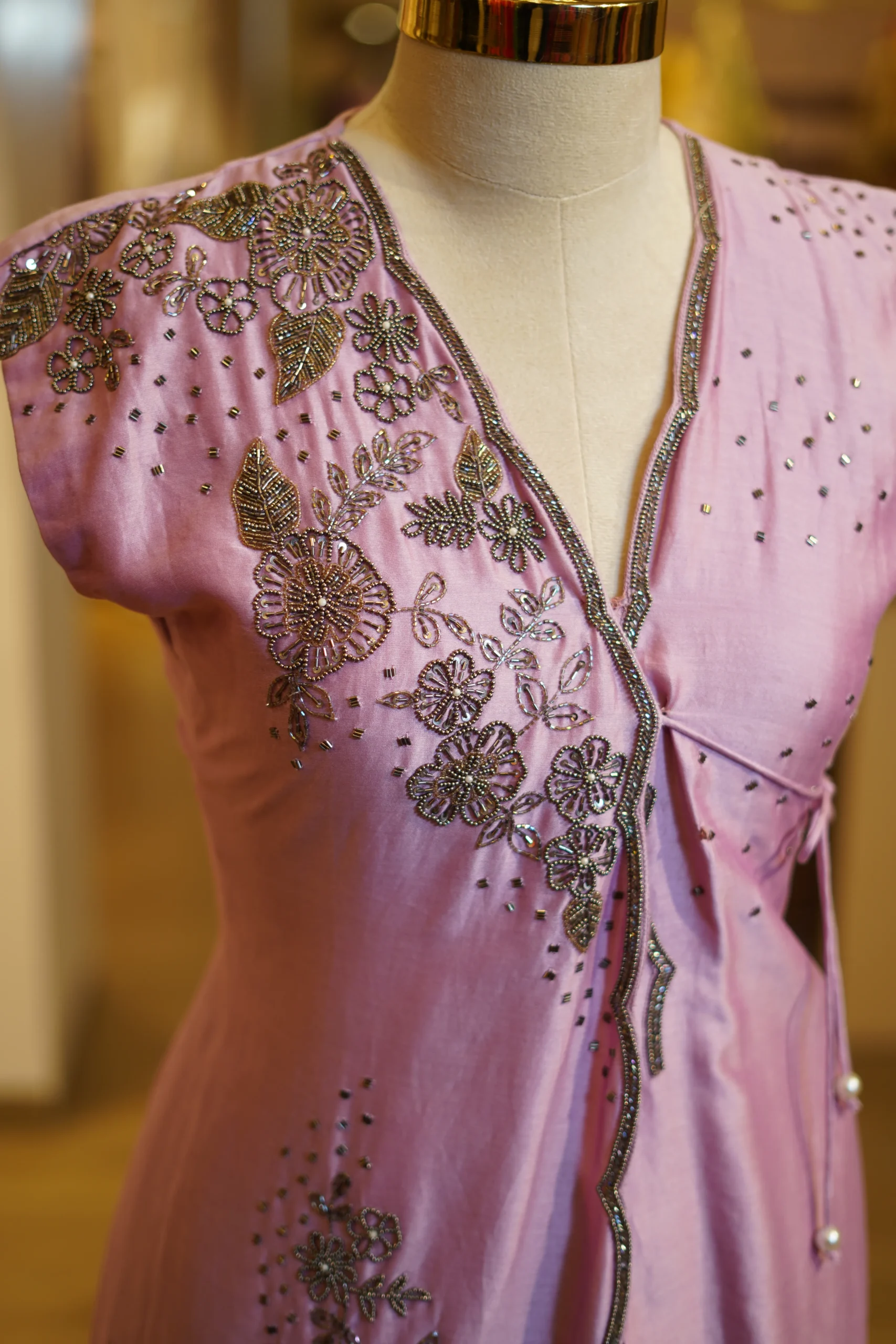 A stylish pink indo-western outfit with modern appeal, perfect for contemporary festive and fusion events.