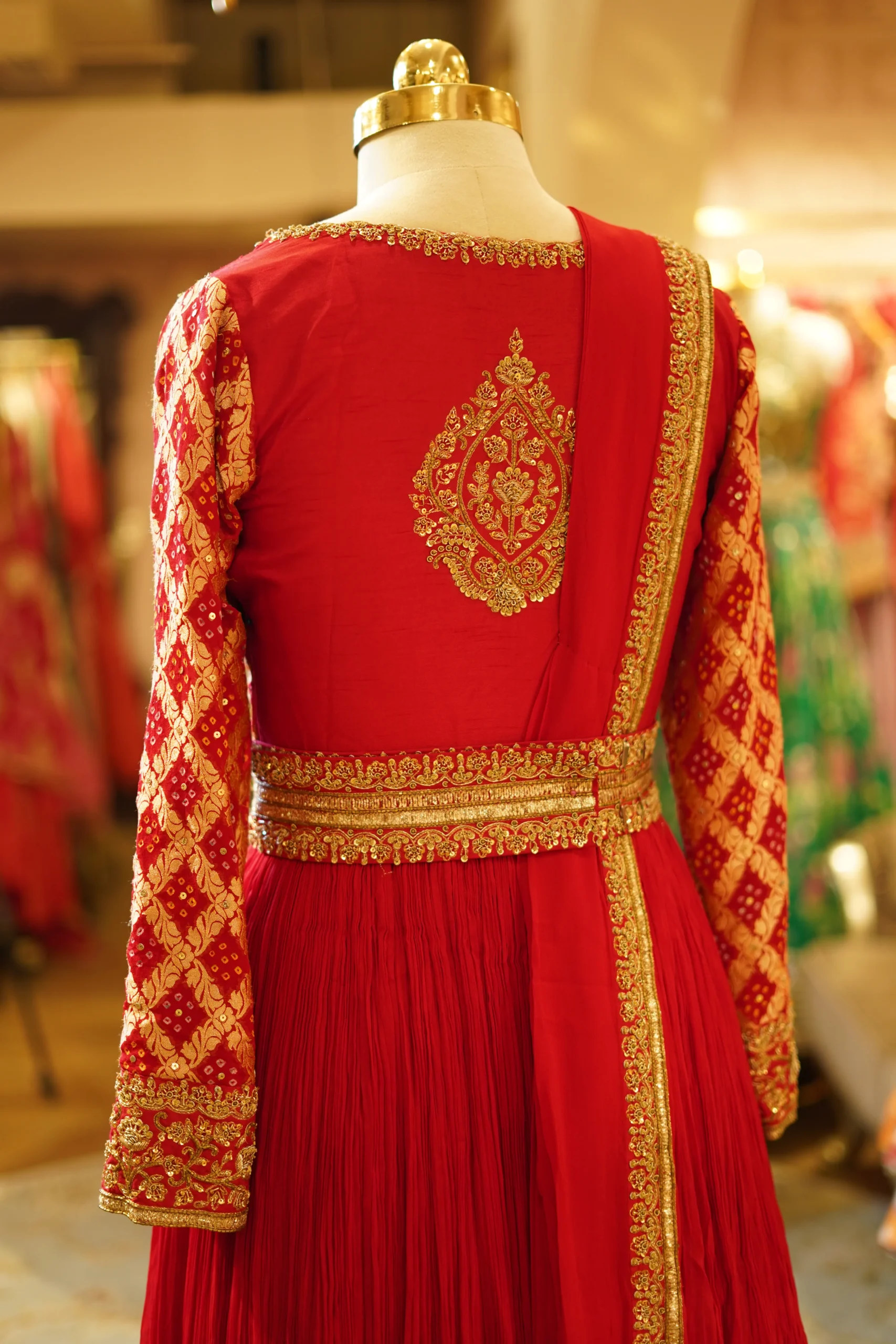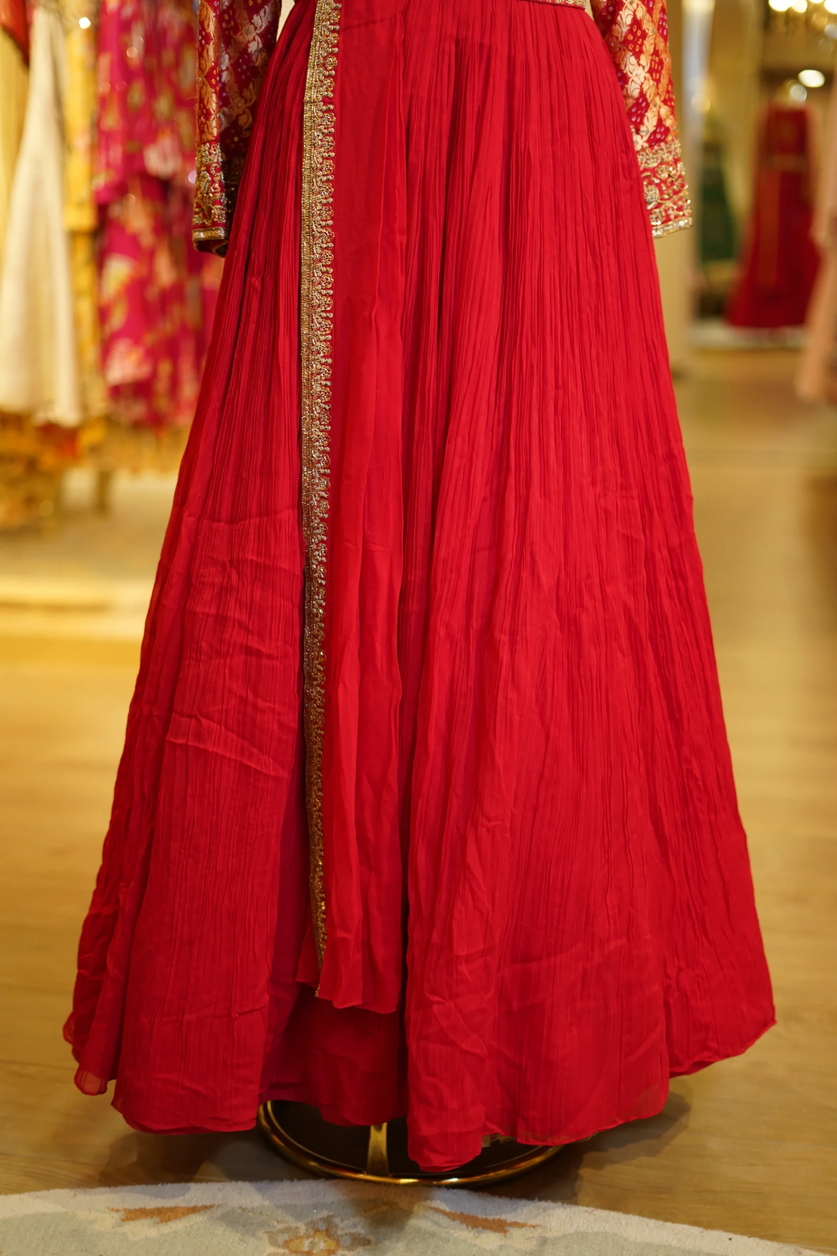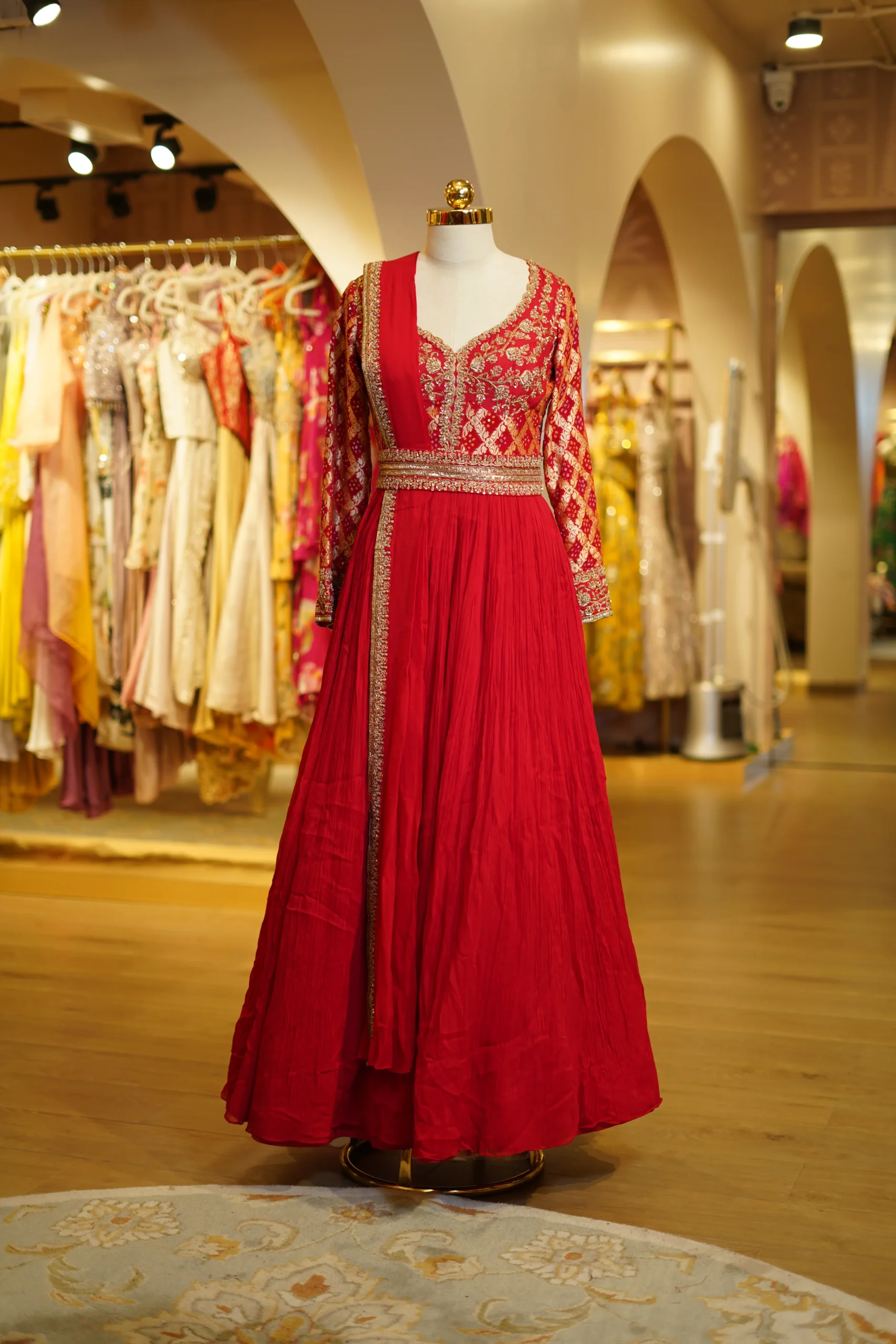 A traditional red anarkali with a flattering silhouette, perfect for festive gatherings and cultural functions.