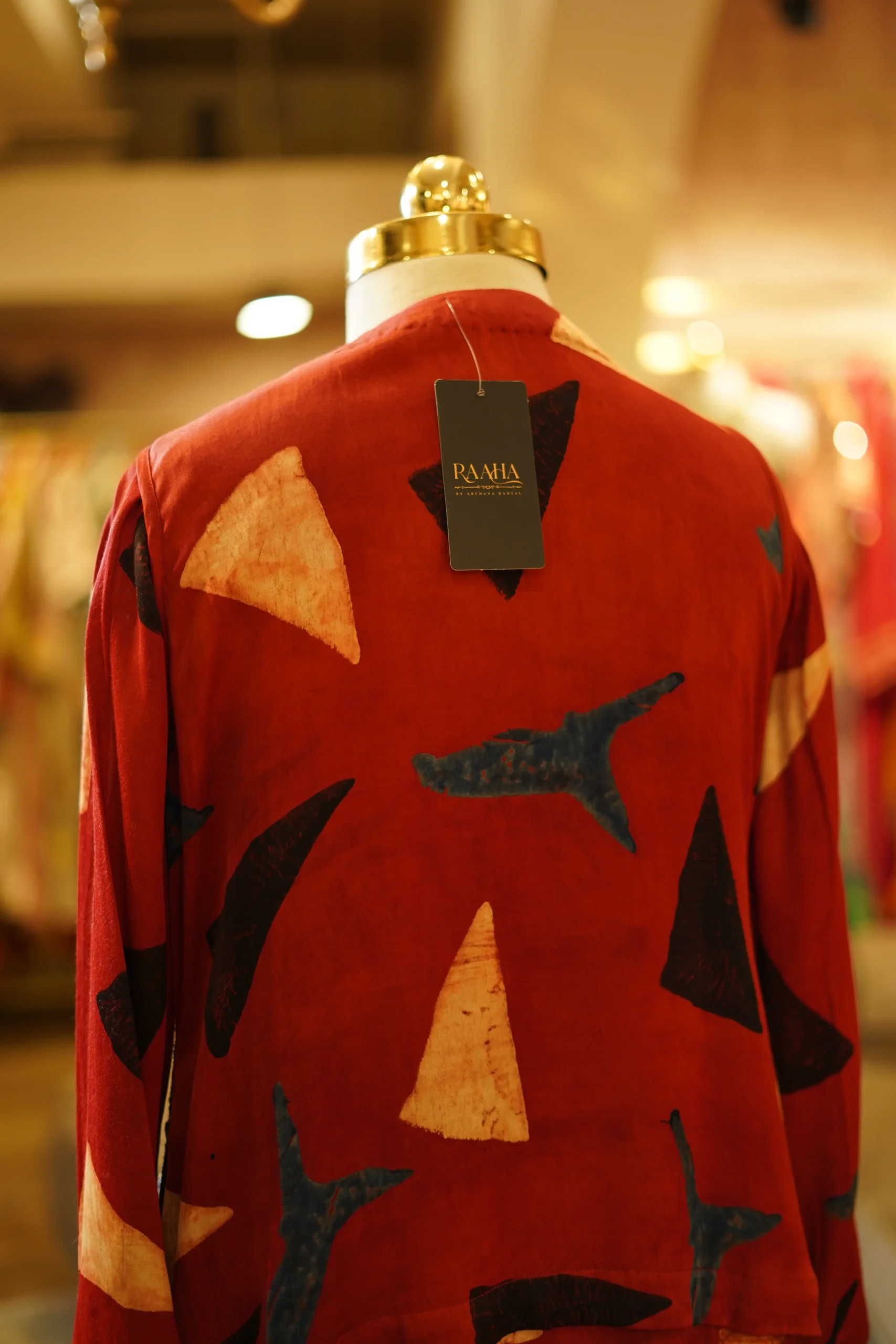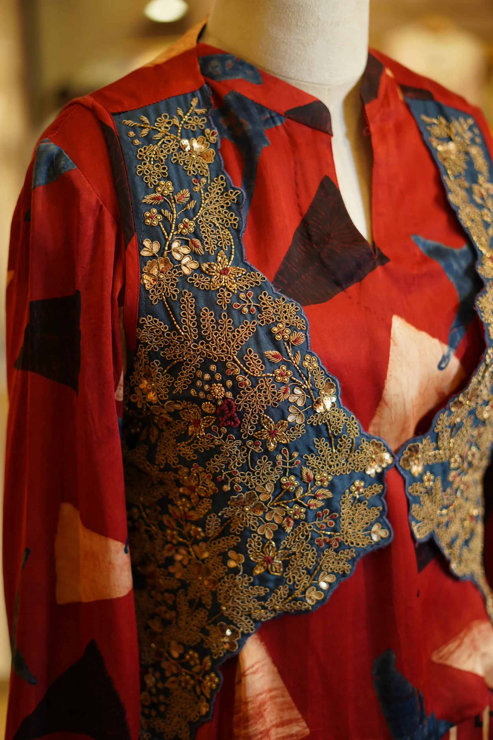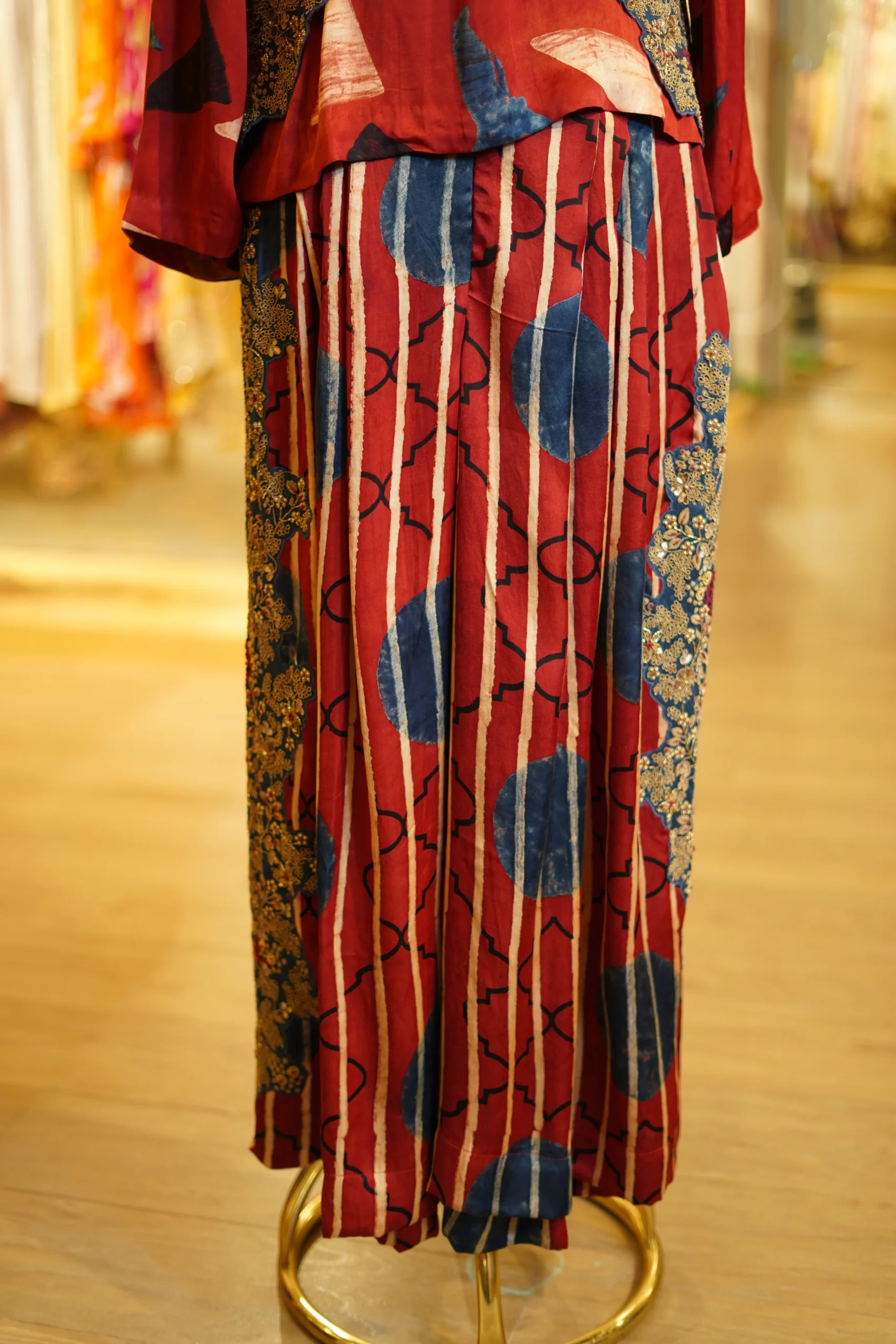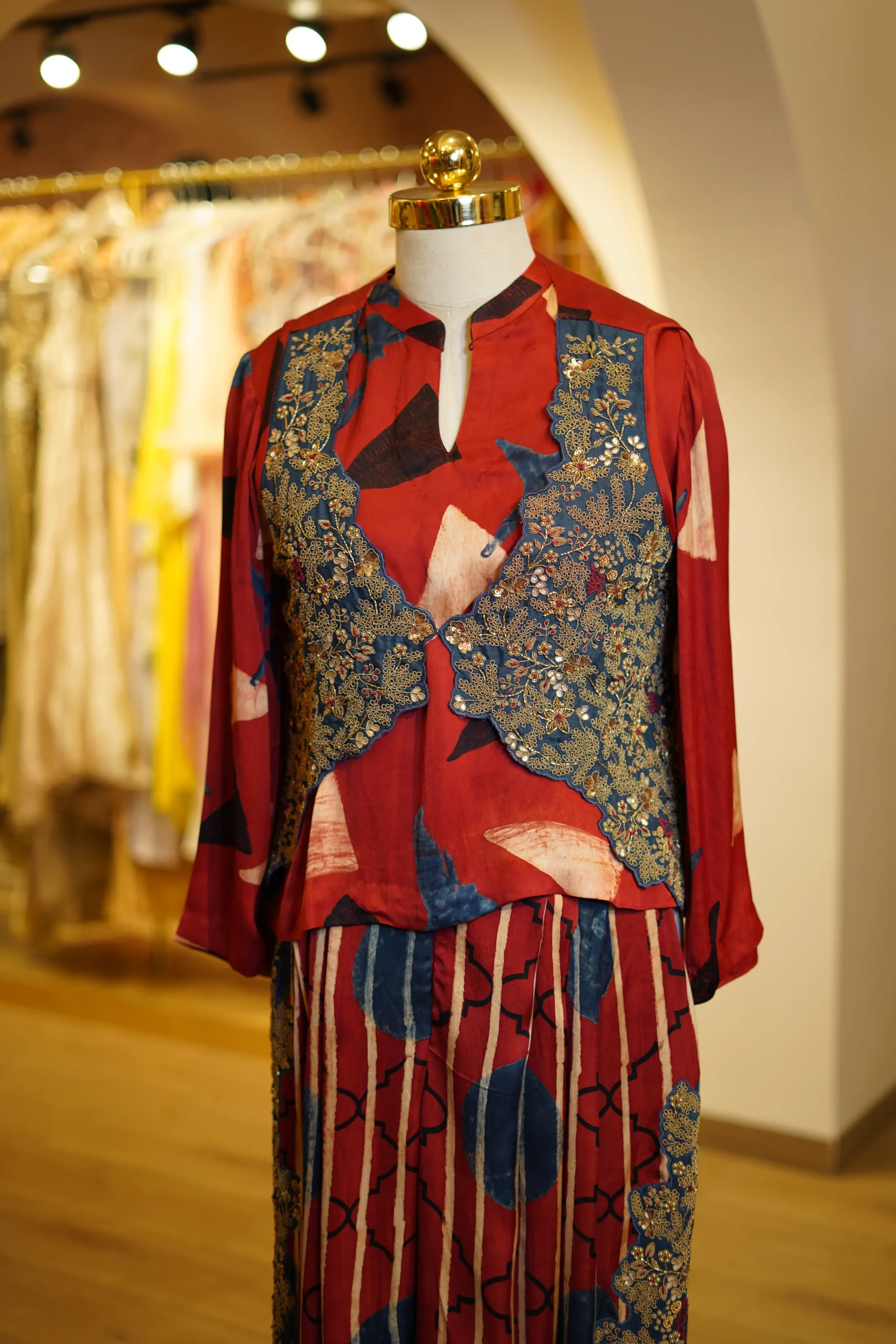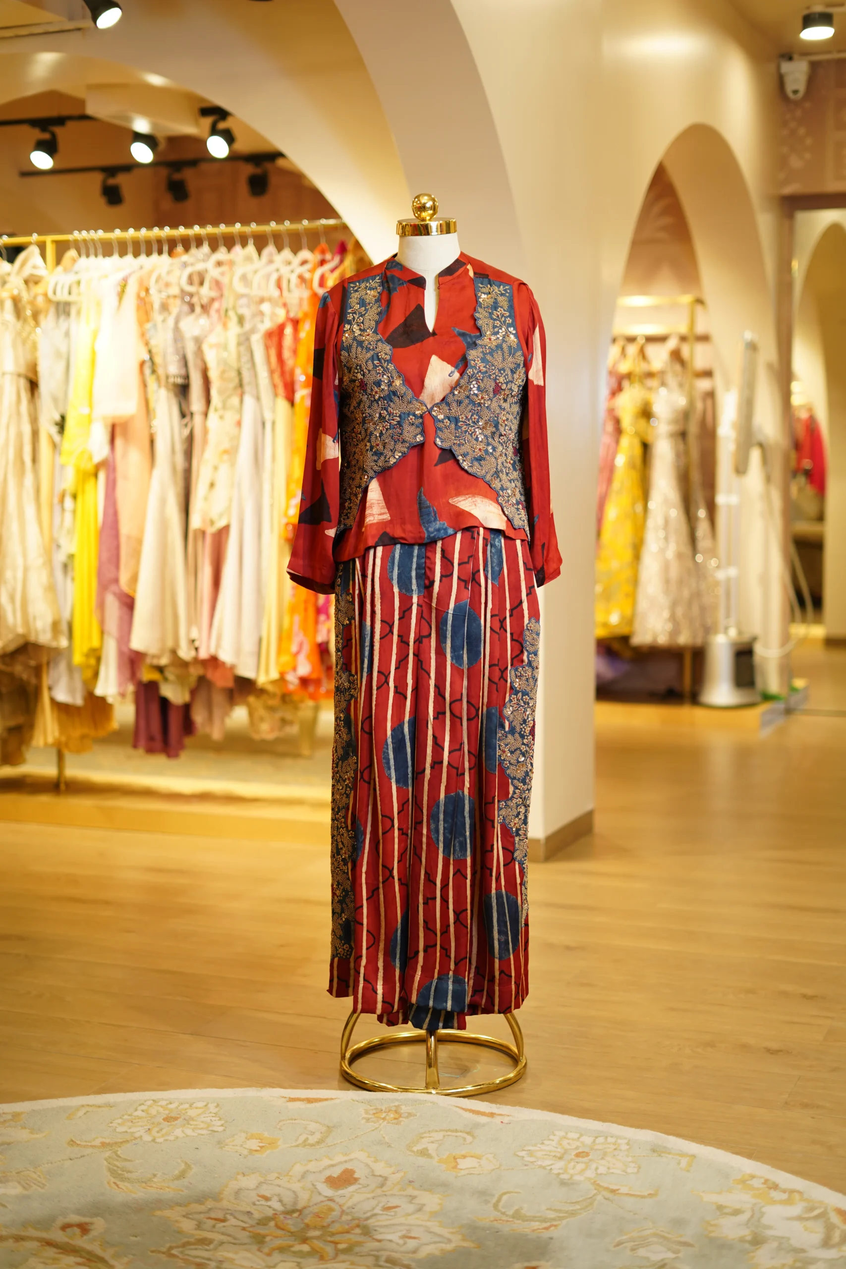 A striking red and blue co-ord set with a contemporary appeal, ideal for festive occasions and stylish day-to-night wear.