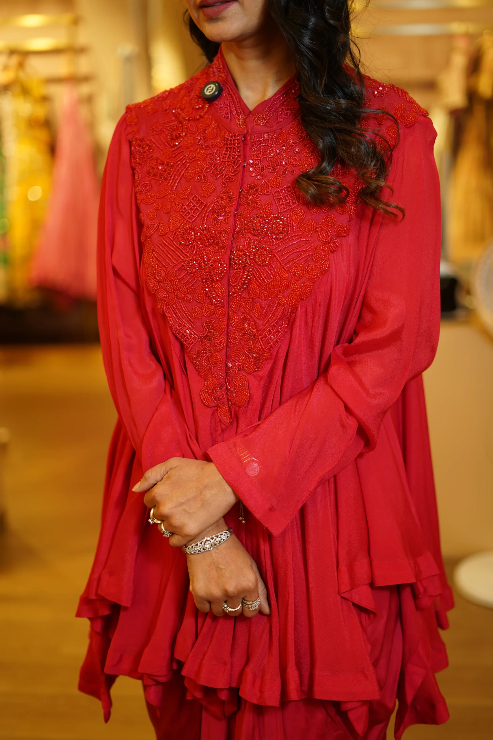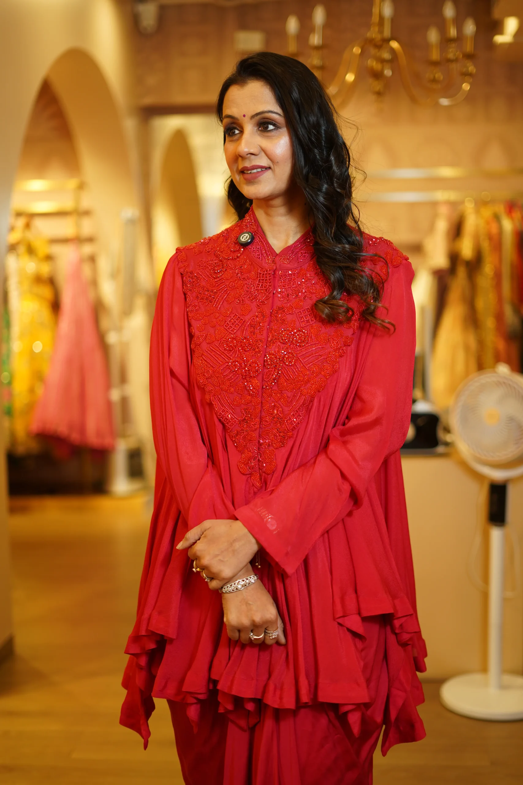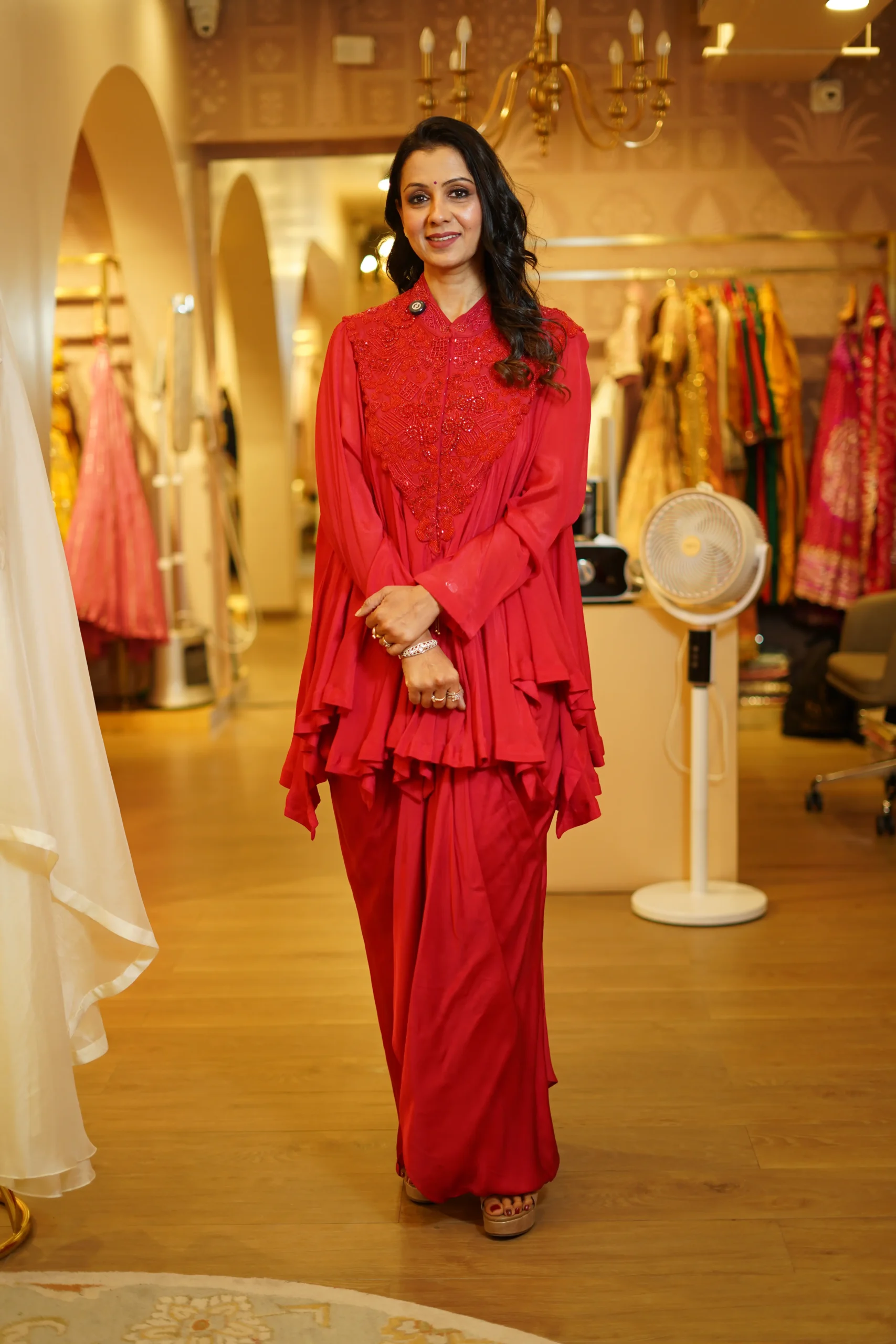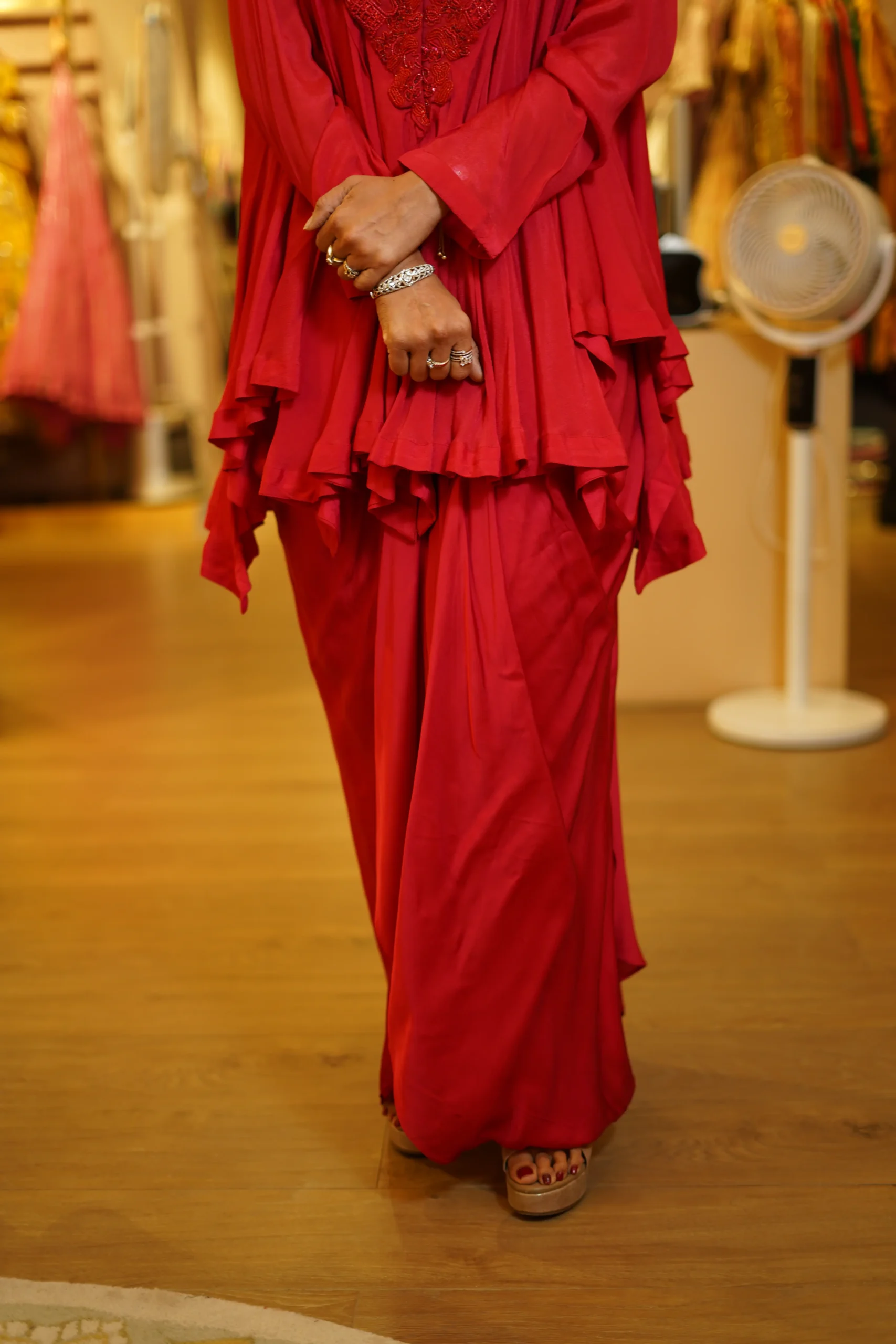 A graceful silk drape skirt paired with a soft chiffon hand-embroidered top, available in elegant beige and red options and perfect for festive occasions and contemporary celebrations ✨💫