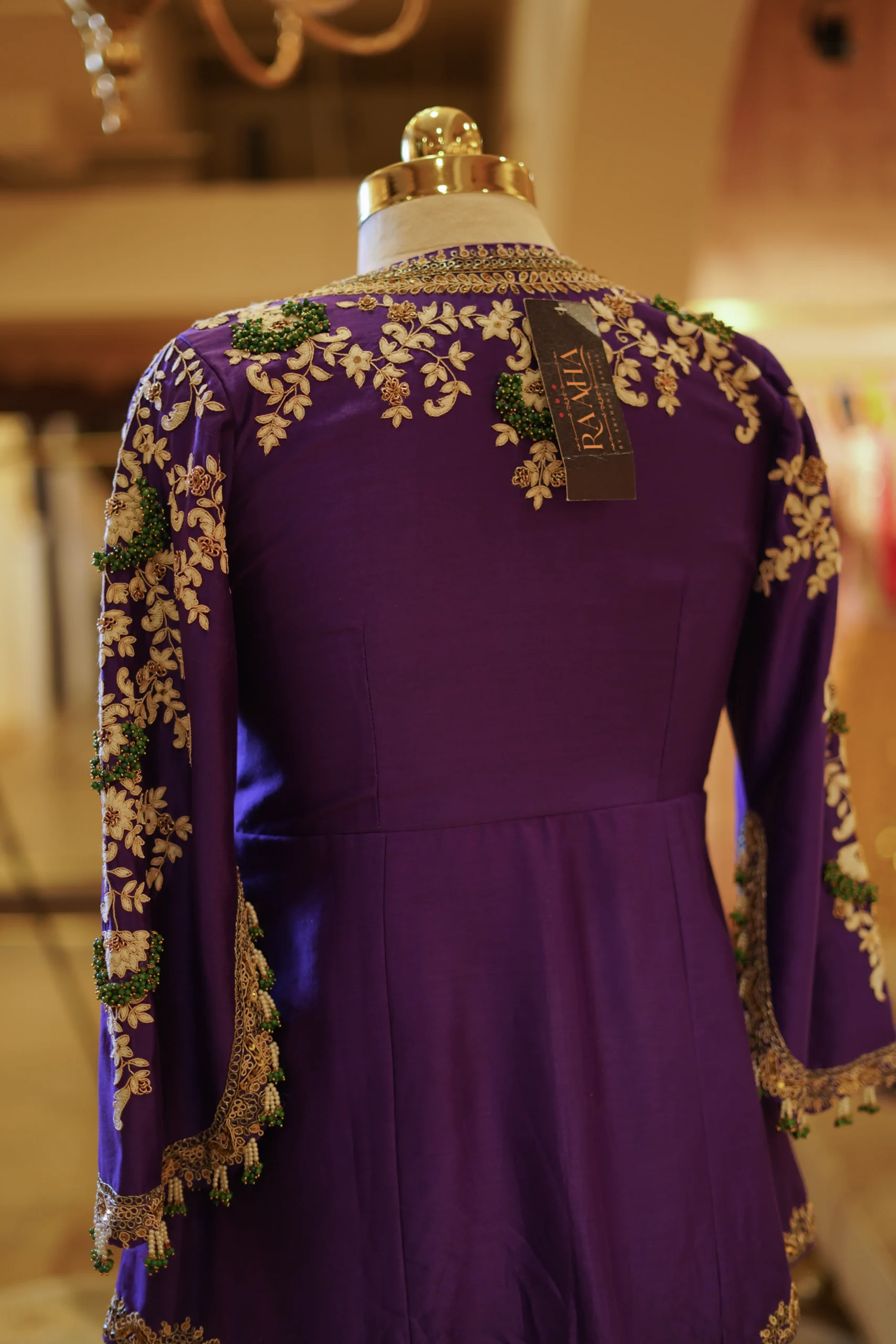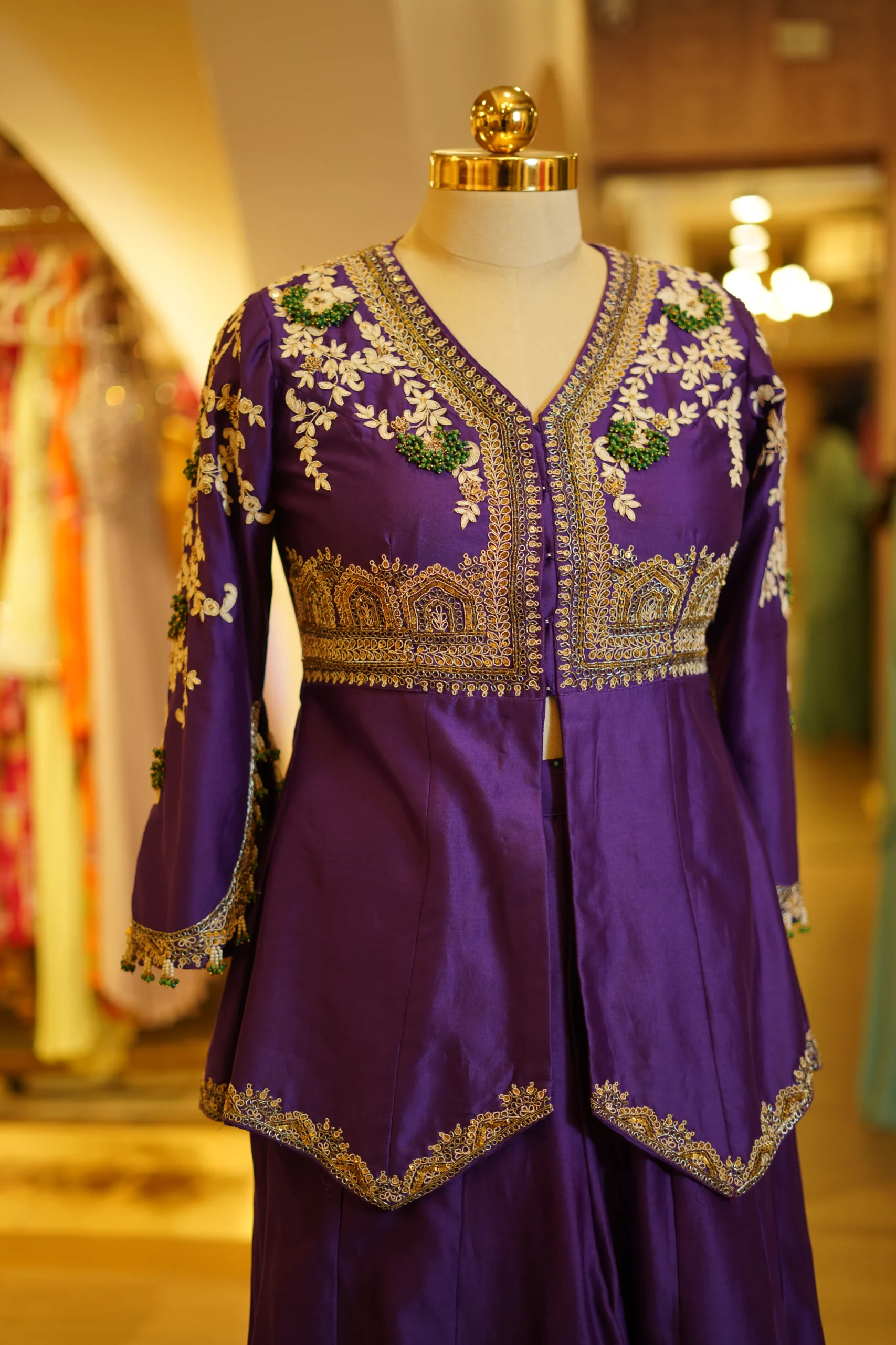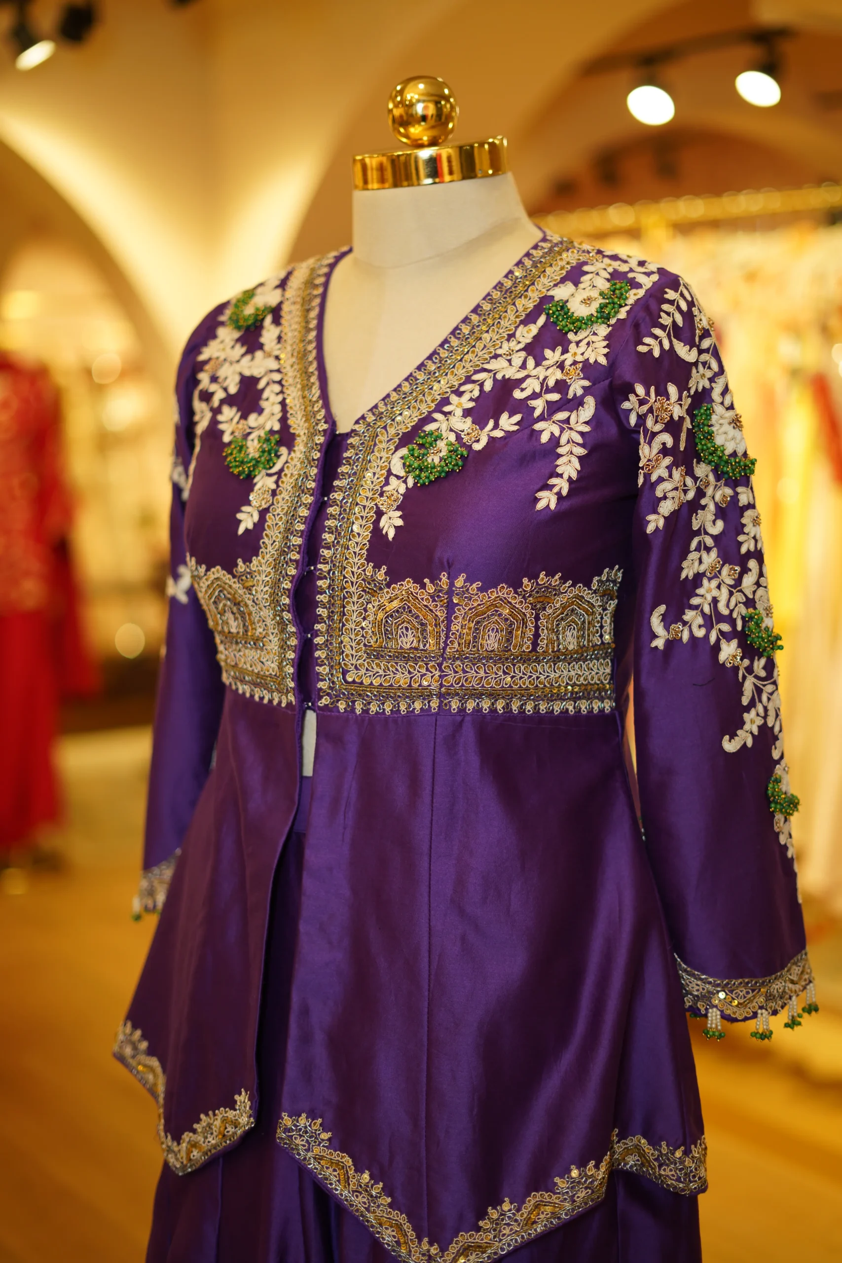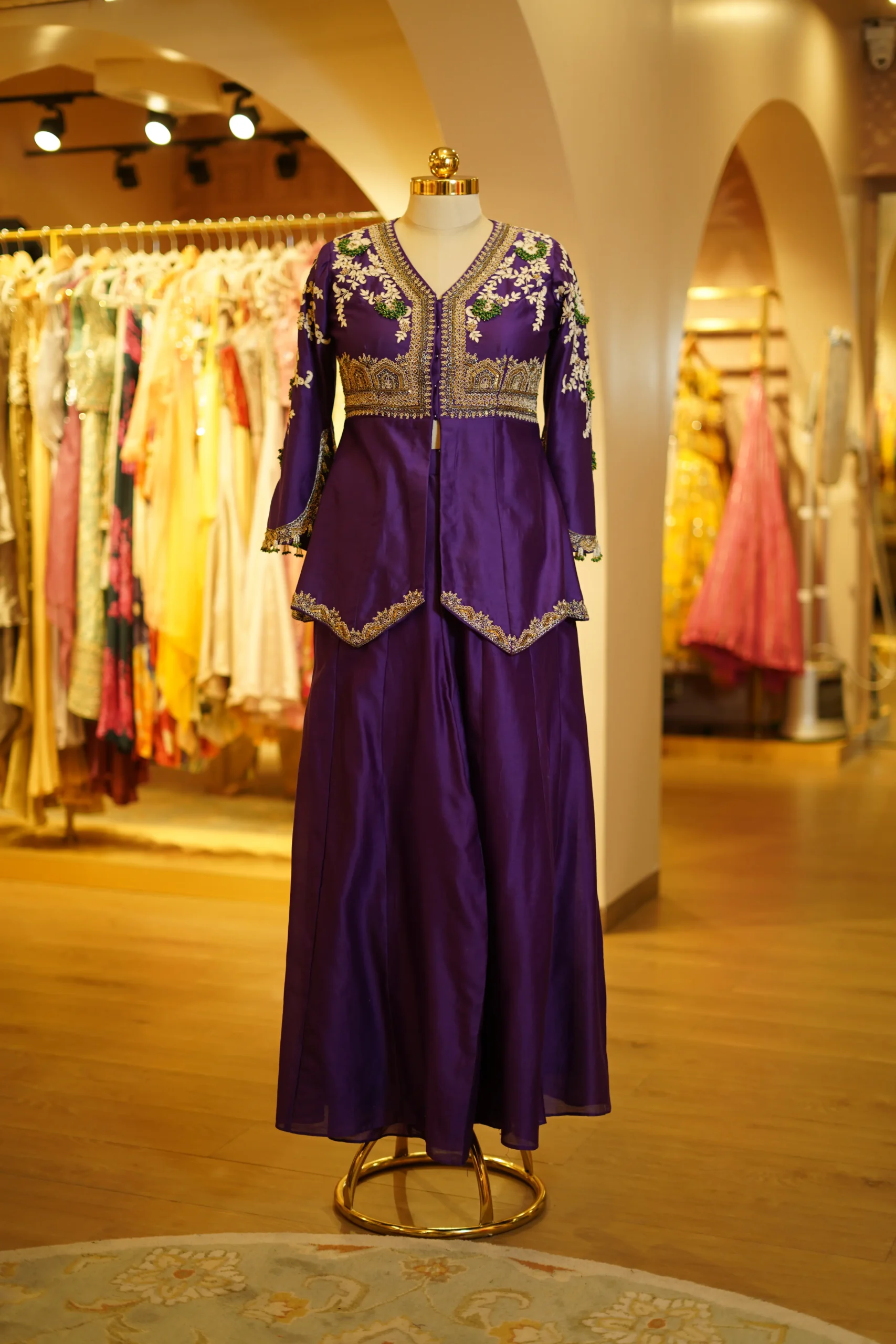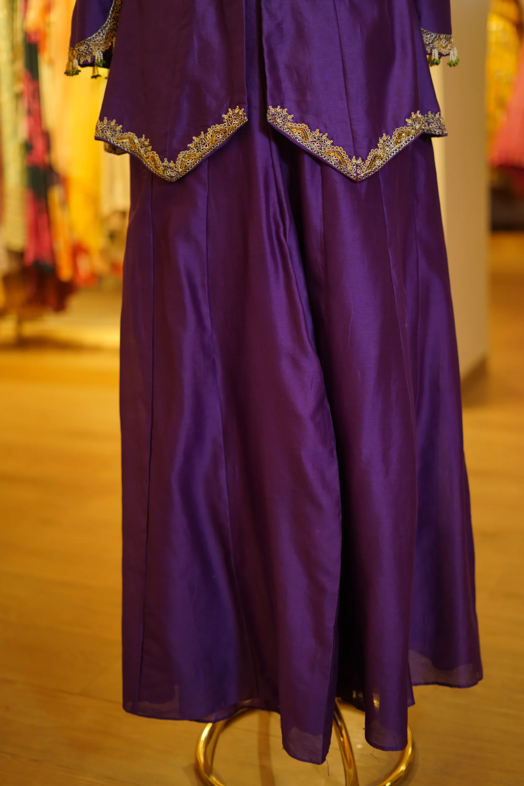 A stylish royal purple silk peplum-style kurta featuring a pointed hemline, bell sleeves with embroidered cuffs, fine zardozi work on the V-neckline, and flowy flared bottoms for an elegant festive and statement-ready look ✨💫