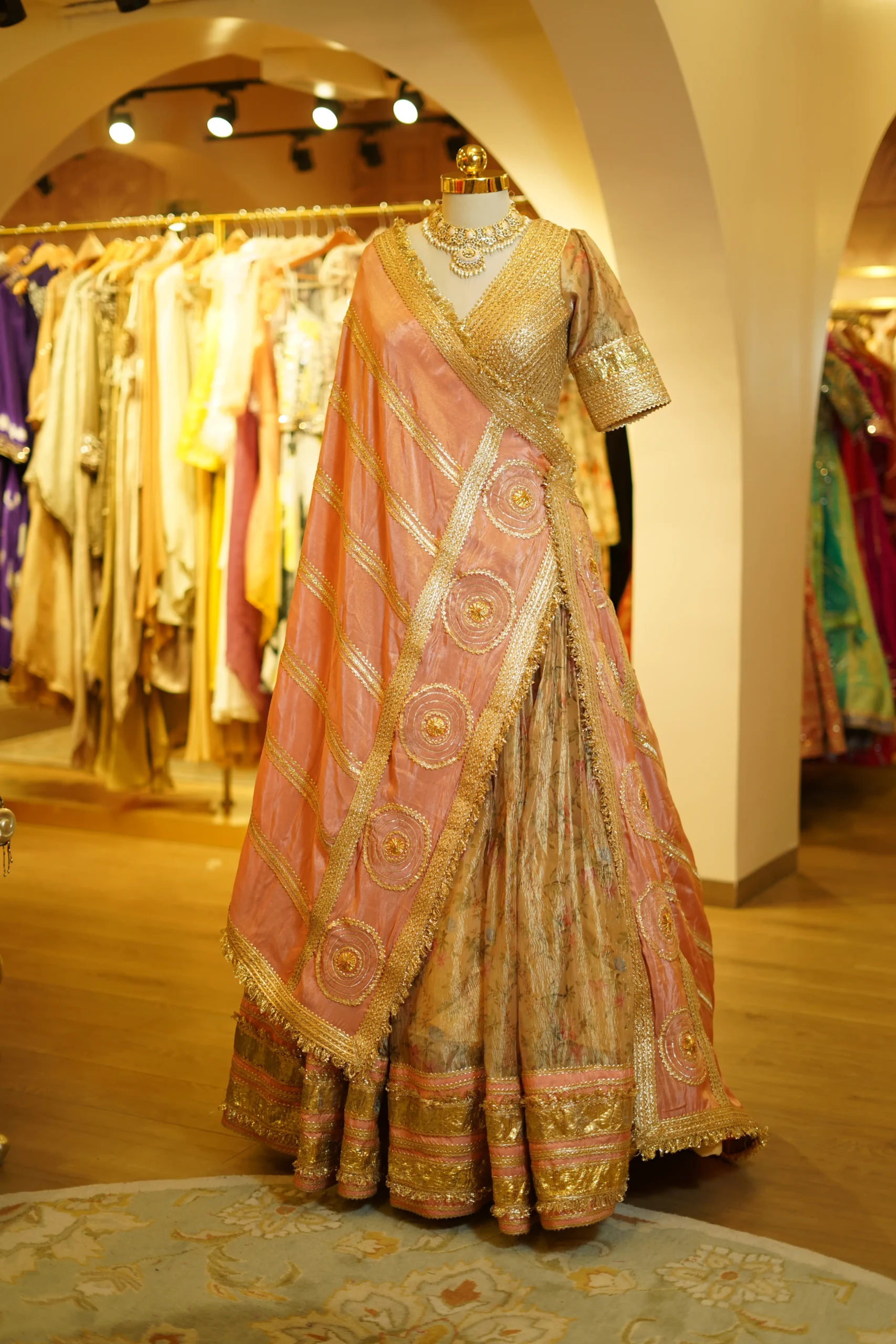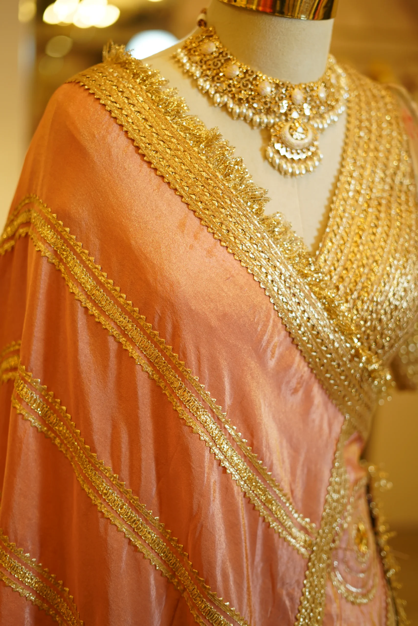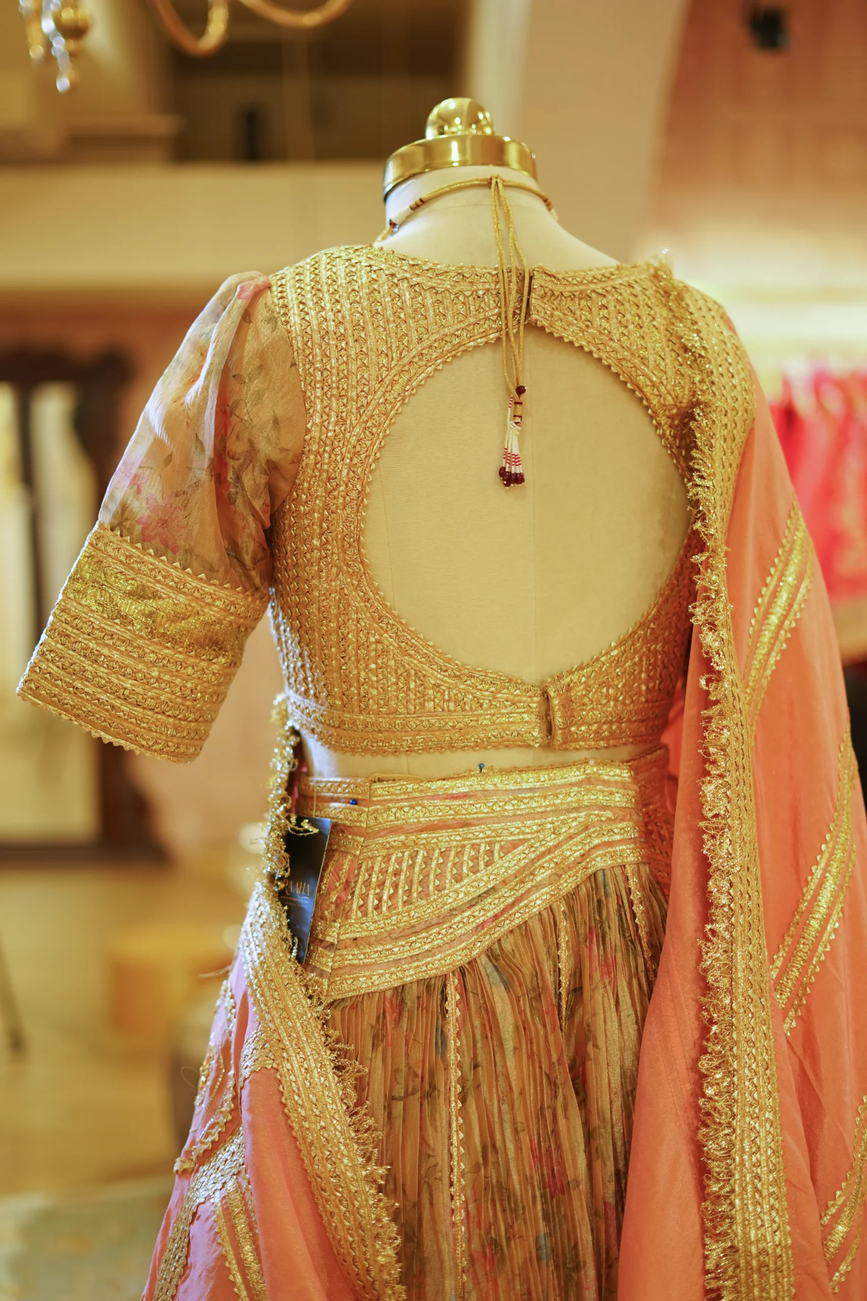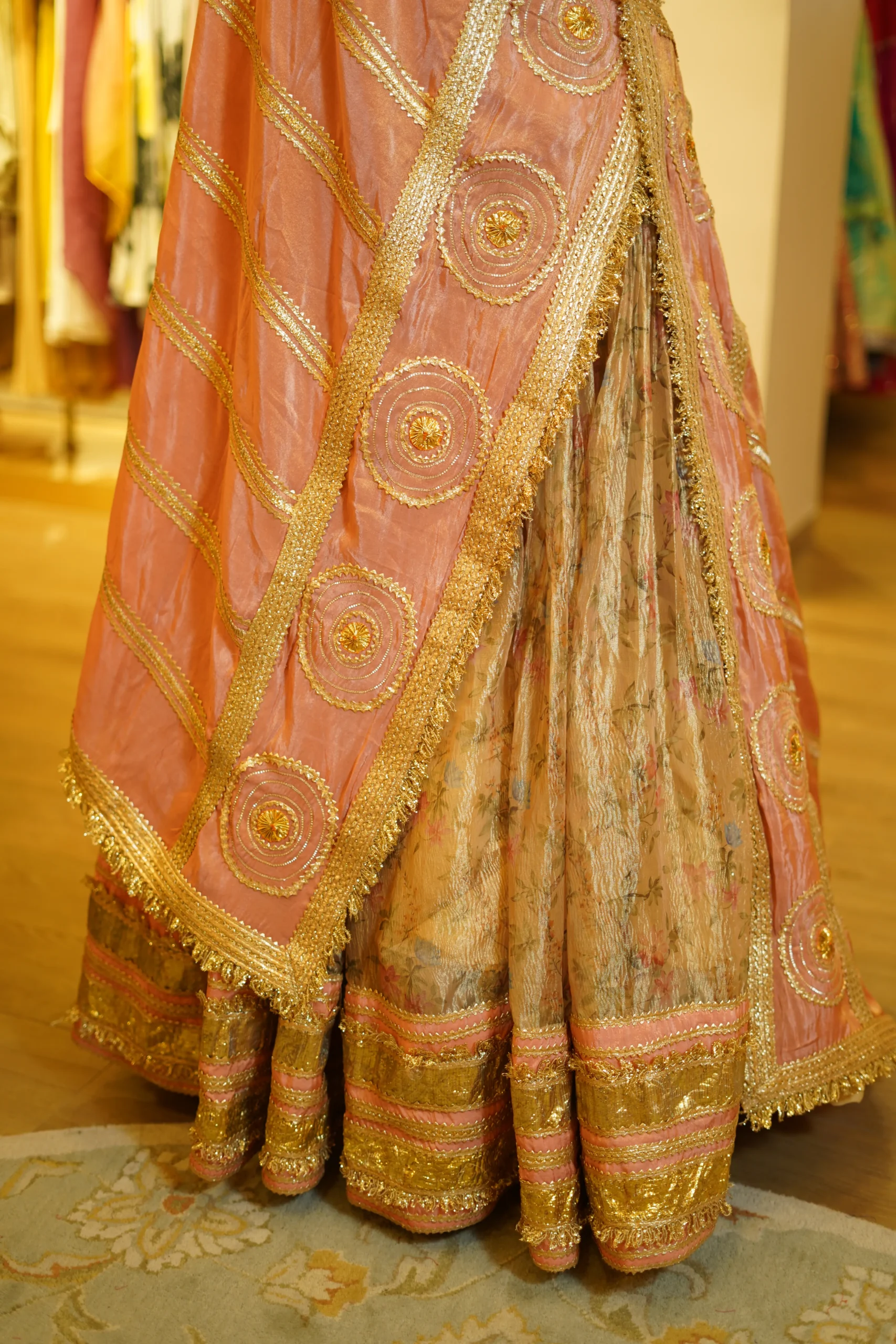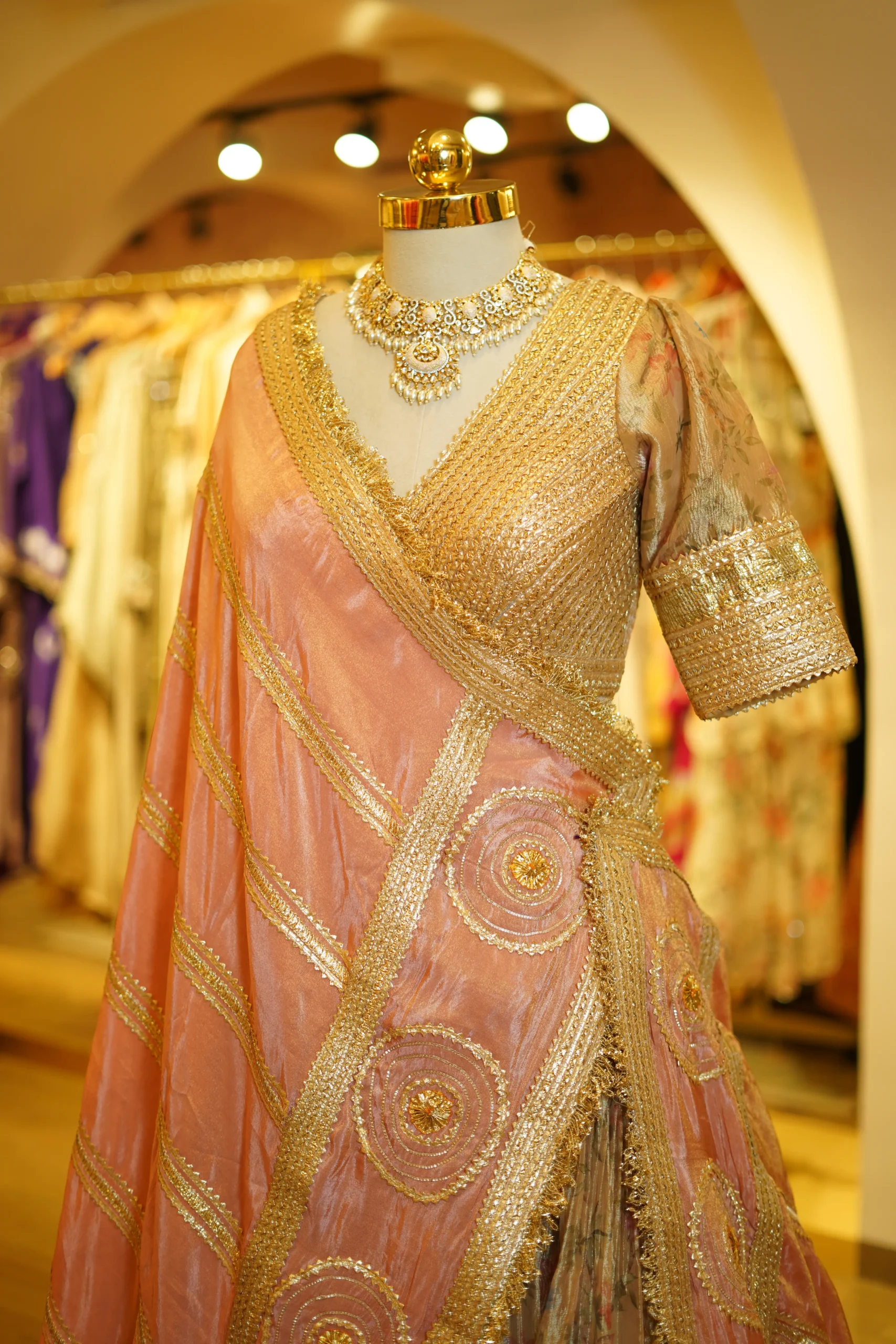 A delicate peach tissue lehenga paired with a traditional zari and gota work blouse, offering a graceful festive silhouette perfect for weddings and elegant celebrations ✨💫