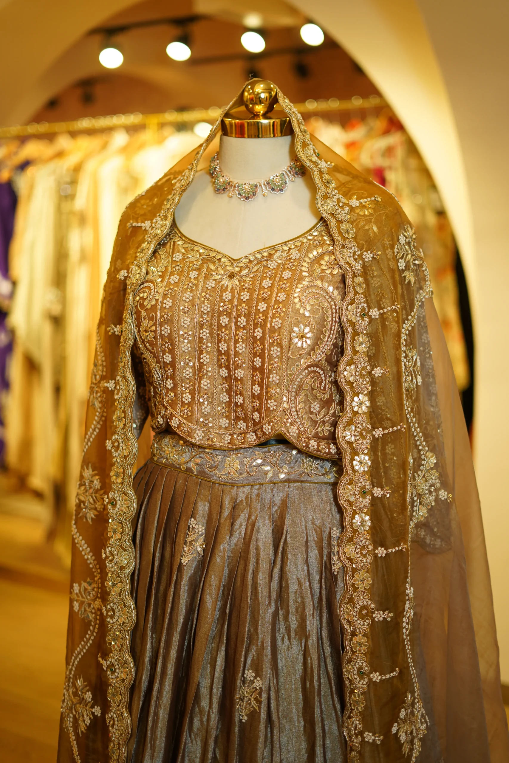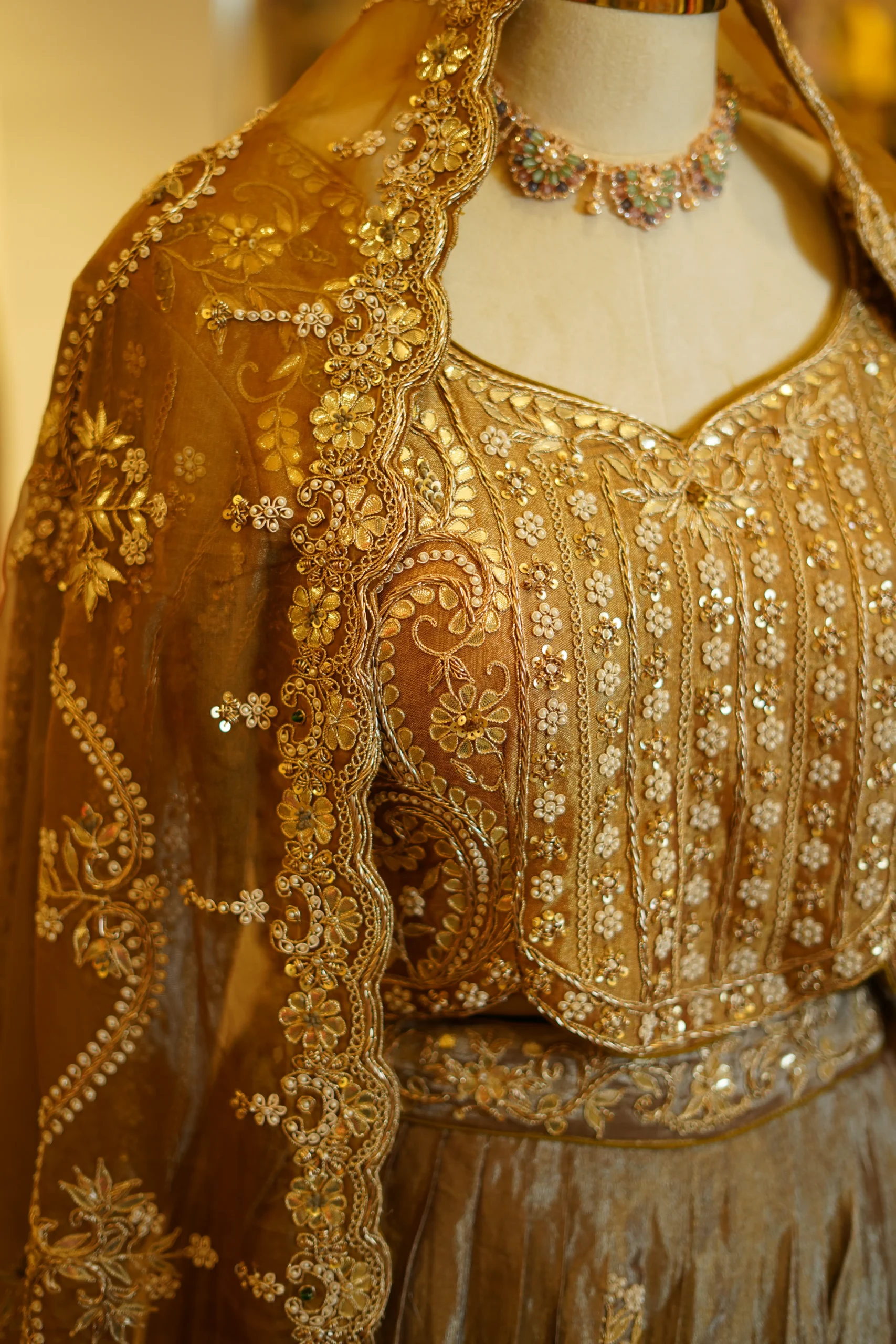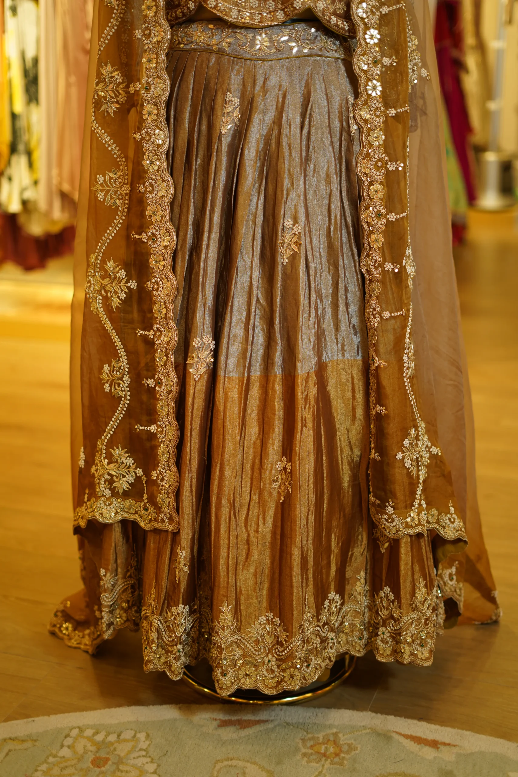 A graceful tissue lehenga paired with a traditional zari and gota work blouse, creating a timeless festive ensemble perfect for weddings and elegant celebrations ✨💫