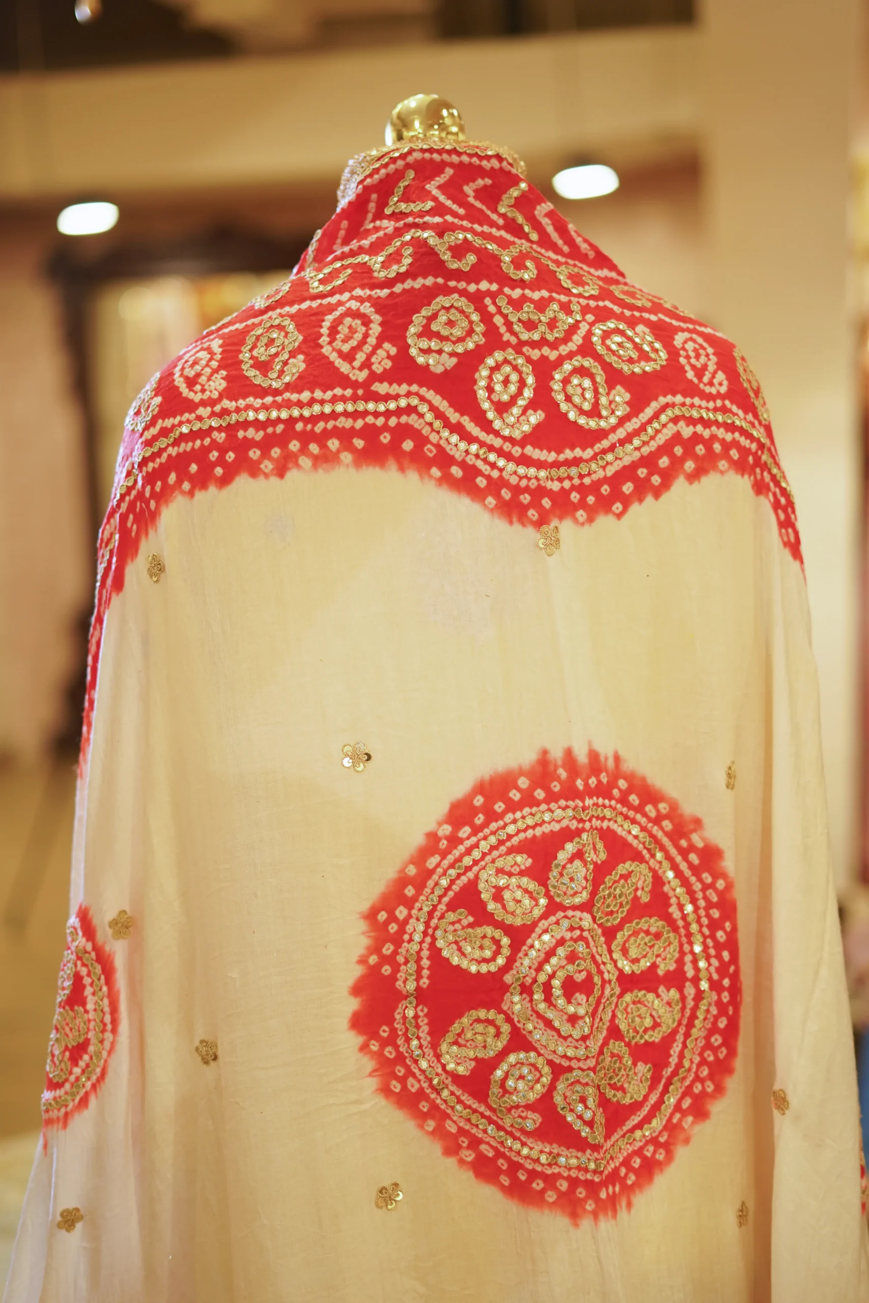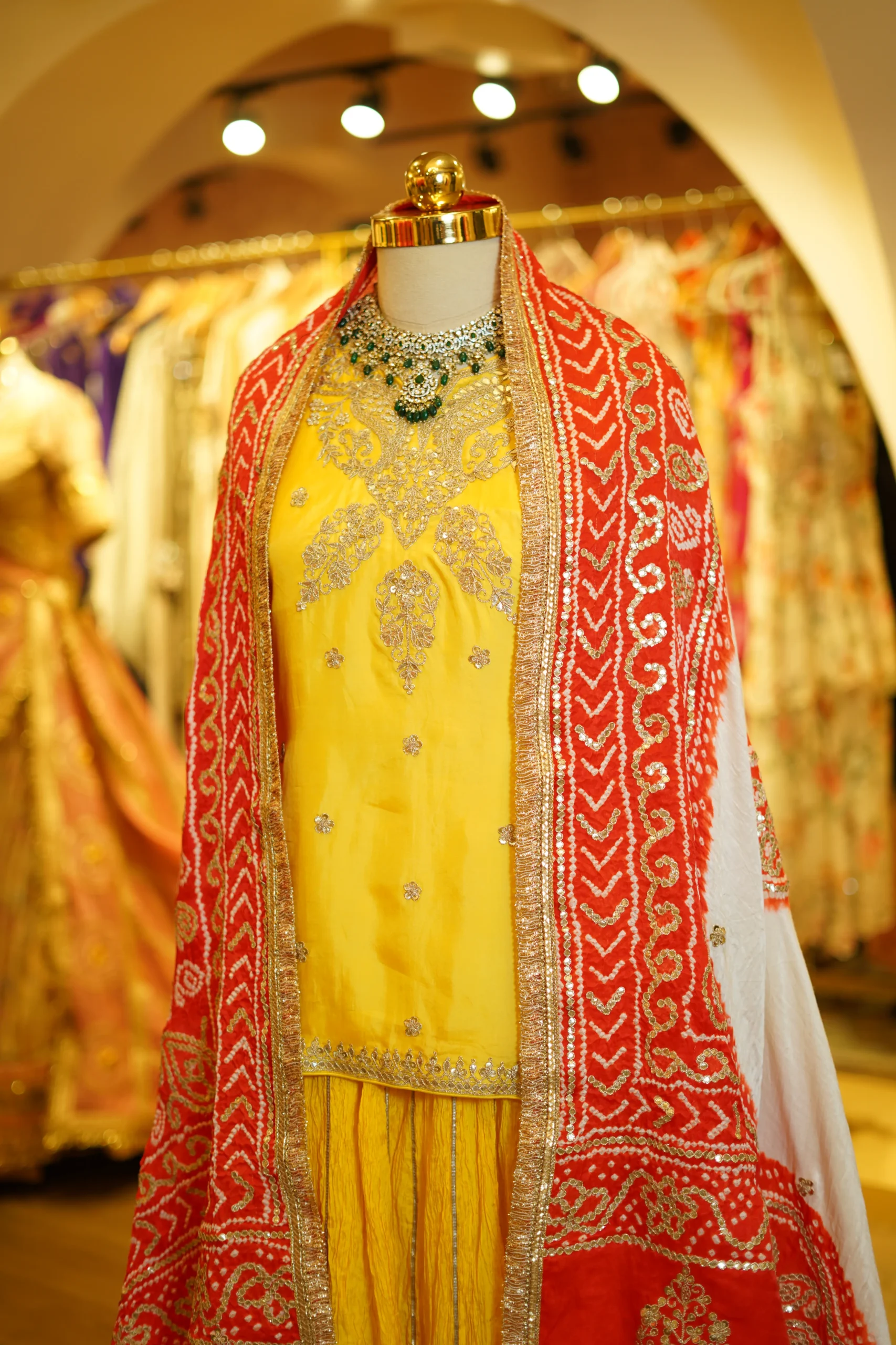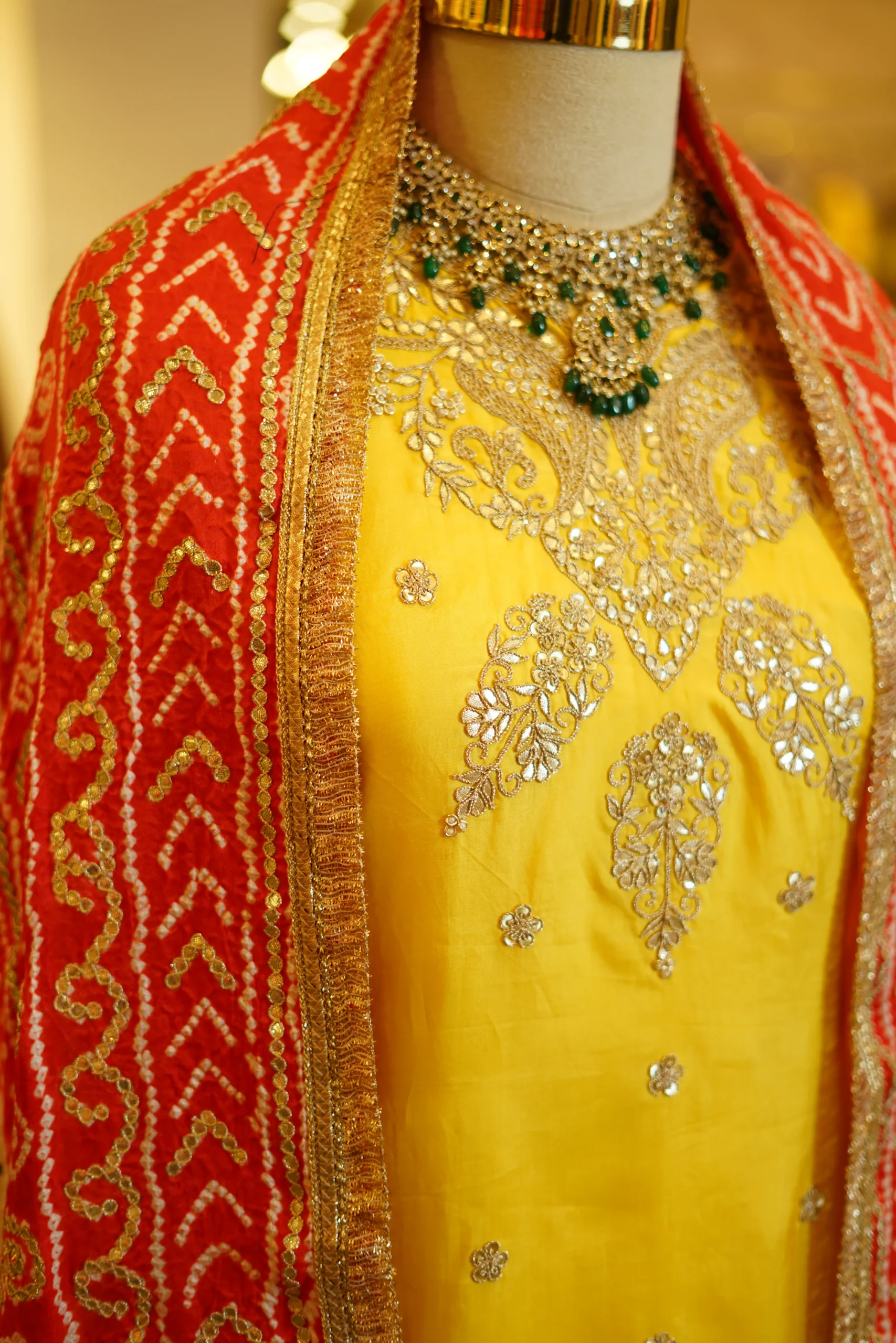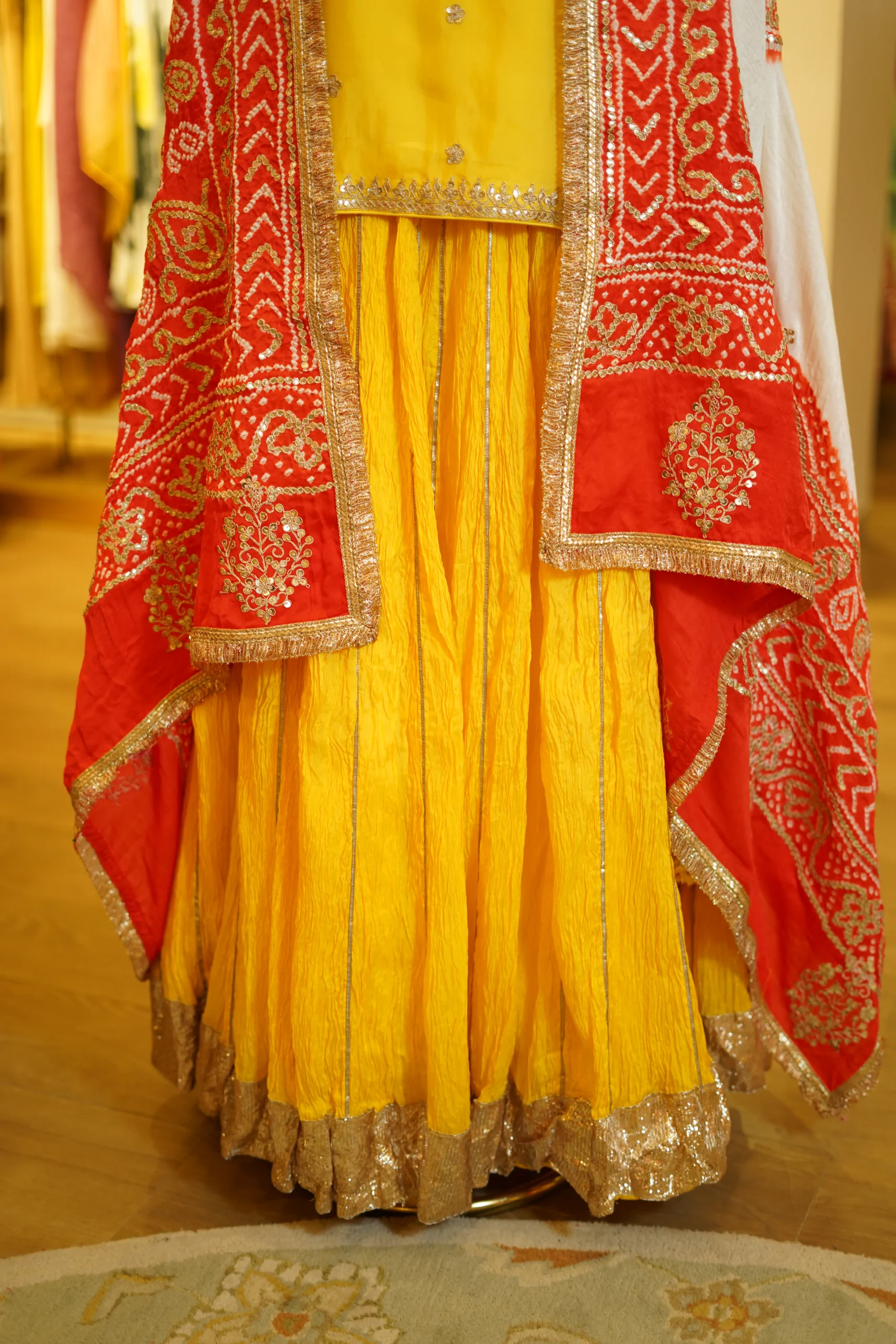 A vibrant yellow crush lehenga paired with a short kurta-style blouse and a traditional orange and white Gaji silk Bandhani dupatta, perfect for festive occasions and cultural celebrations ✨💫
